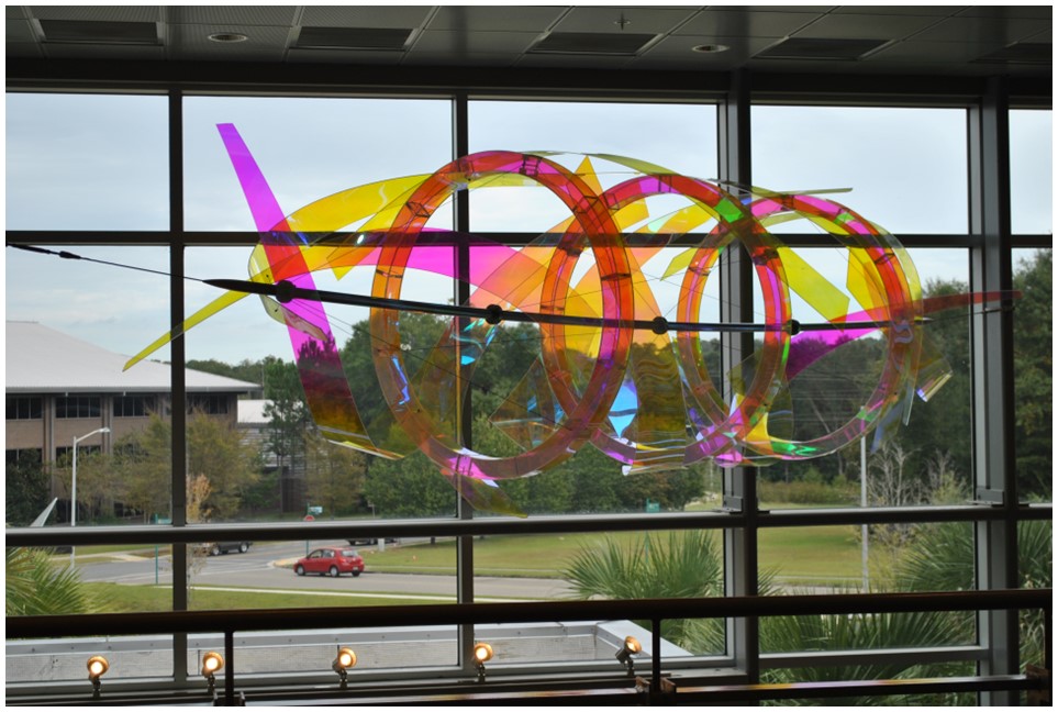 Diagonally spanning the atrium of the entry lobby is a suspended sculpture composed of curved dichroic acrylic, stainless steel tube, hardware and cables. The work is composed of two dichroic elements: three concentric circular forms surrounded by swirling ribbons. These represent the research done within the facility on propulsion, mechatronics and energy. The work is located slightly above eye level from the balcony overlooking the atrium space.