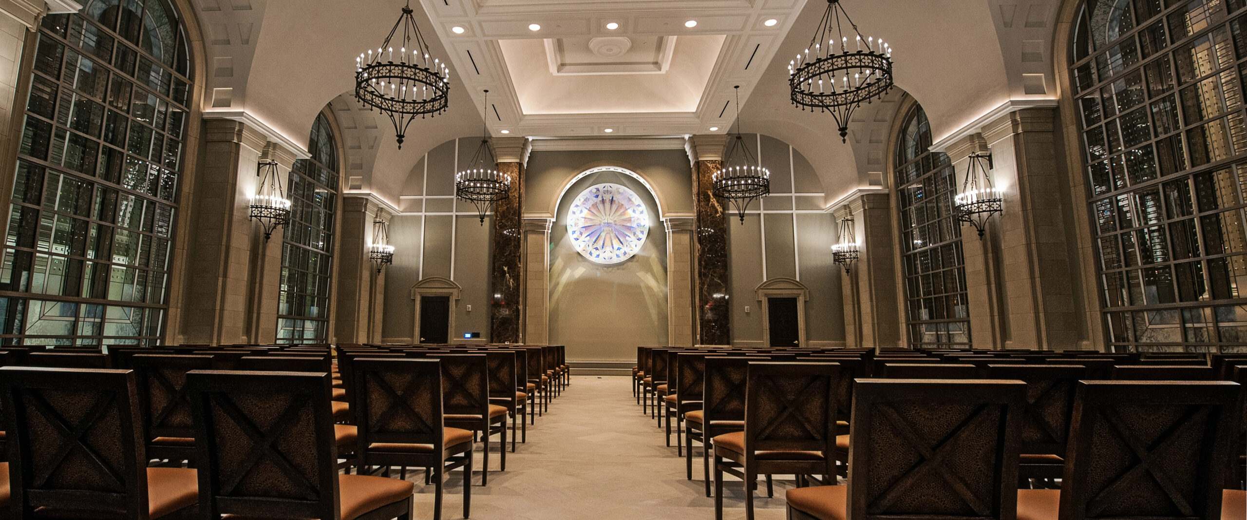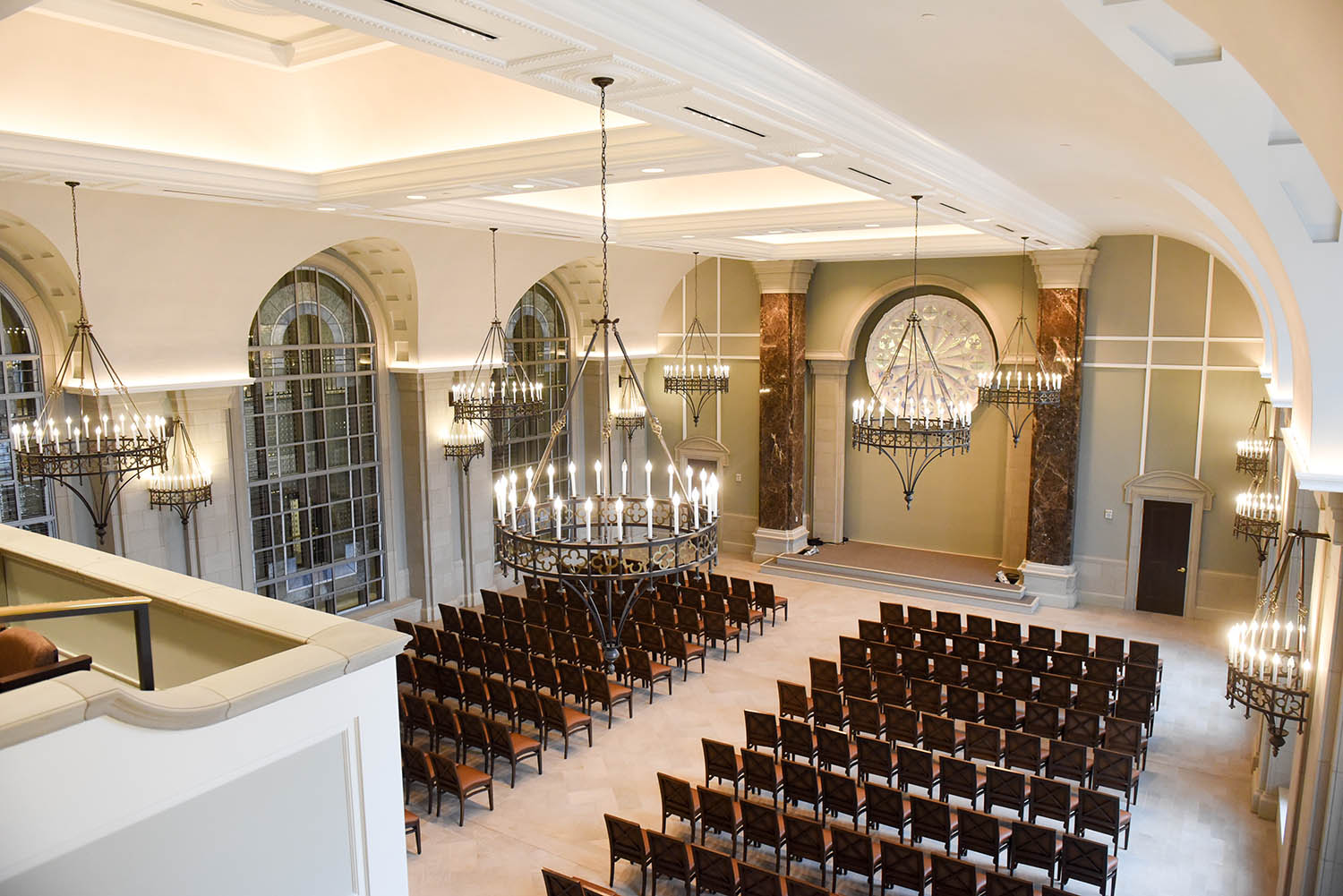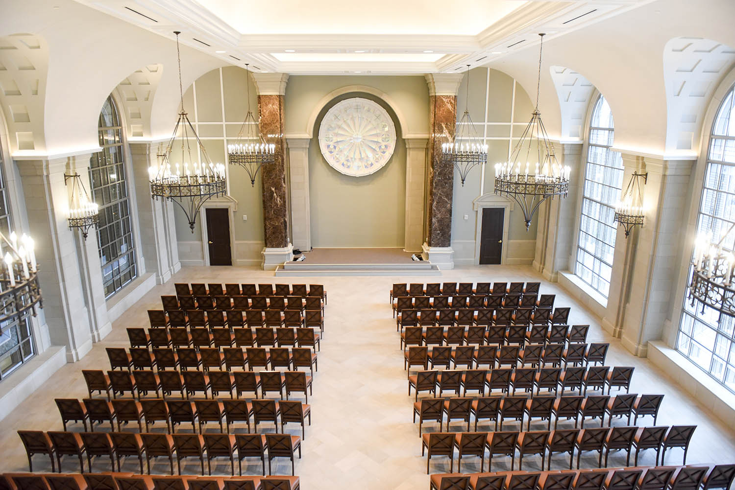 The chapel at Belmont University features six monumental windows, approximately 8 feet wide by 24 feet tall, composed of laminated beveled and antique leaded glass. These windows are designed to reflect sparkling light at night when viewed from outside, enhancing the chapel’s presence after dark.