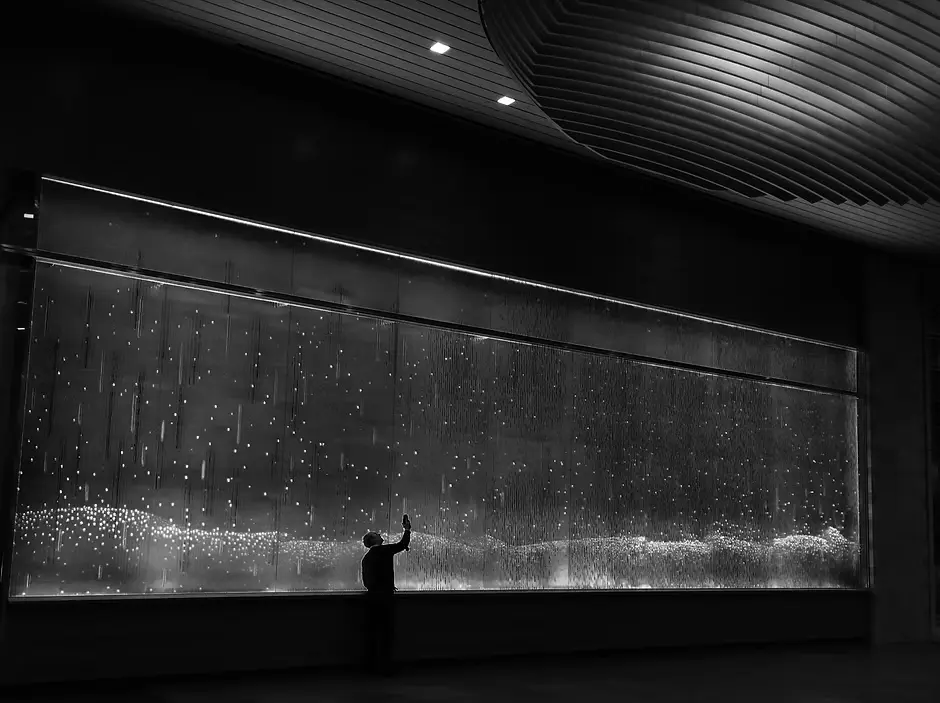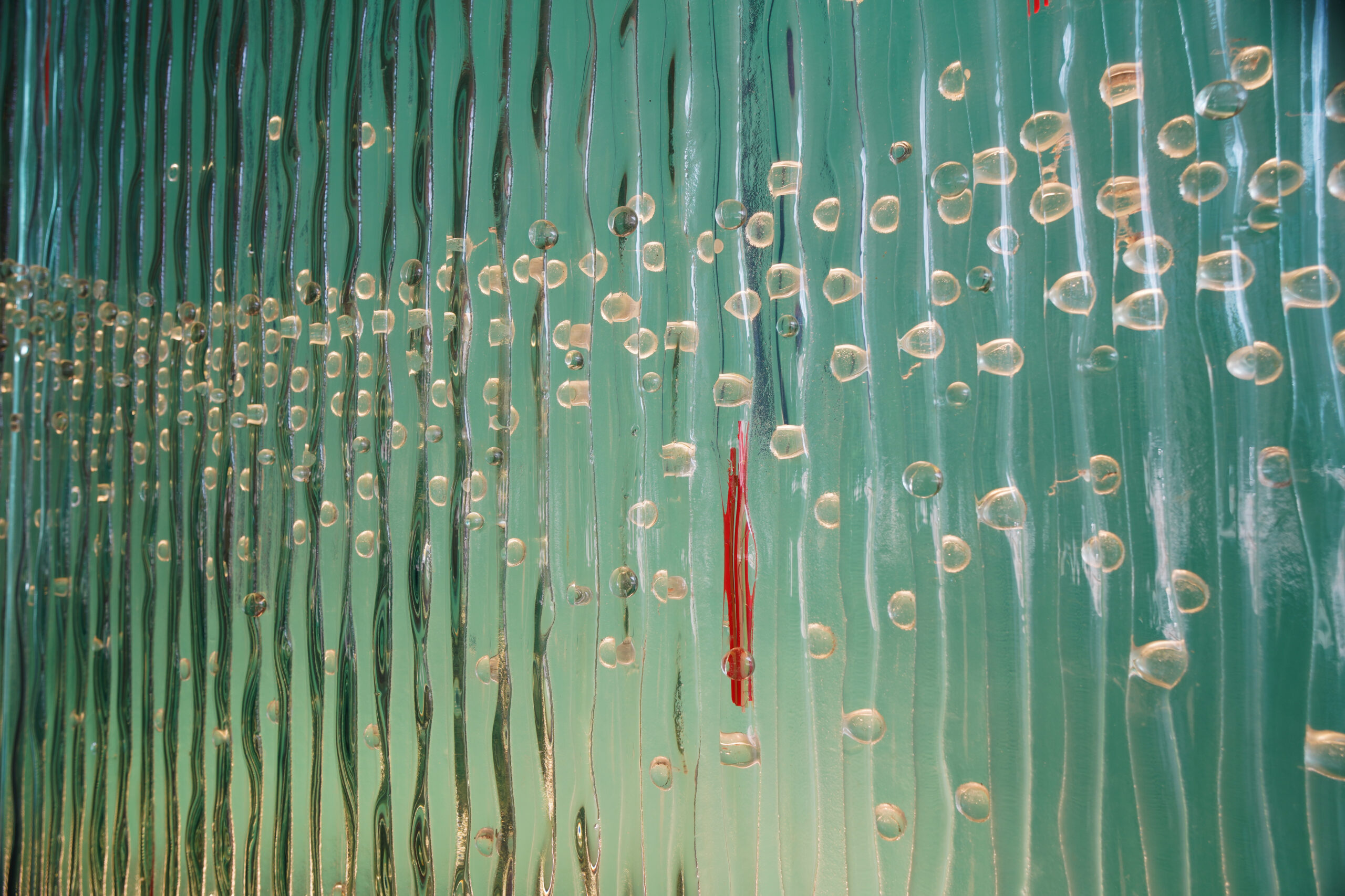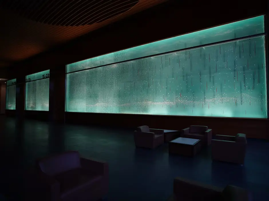Measuring over 100 feet in length and 15 feet in height, the custom glass wall is constructed from cast and tempered glass. Laminated glass lenses are installed on the front surface to create additional depth and visual texture. The entire feature is illuminated by LED lighting from a concealed cavity, which projects light onto a gradated blue background wall, enhancing the coloration and transparency of the glass.