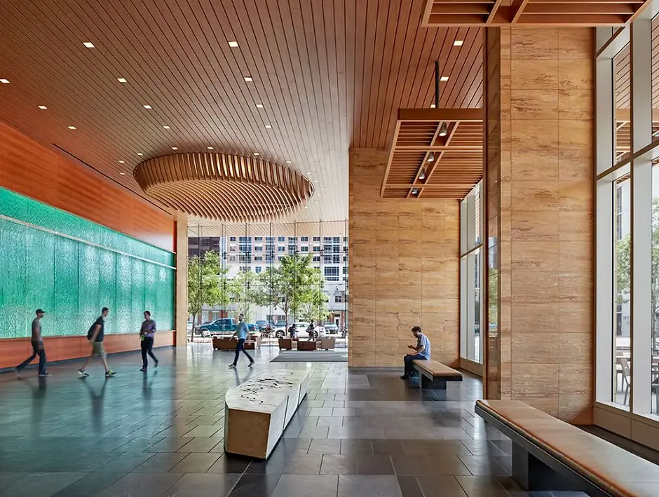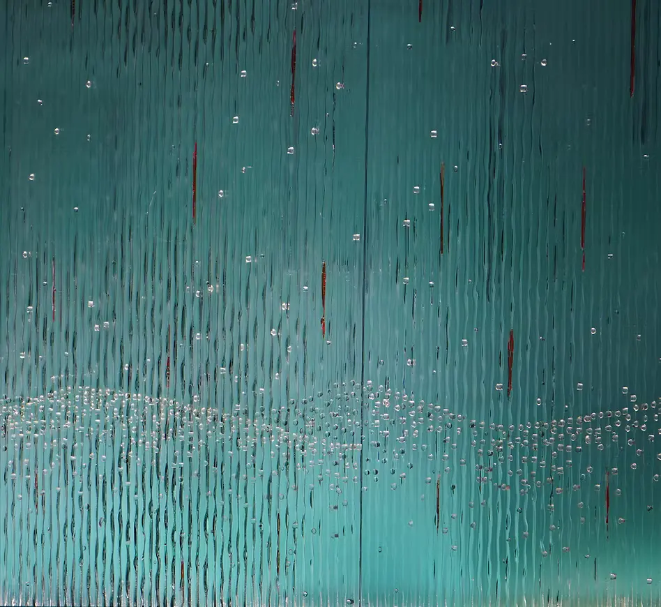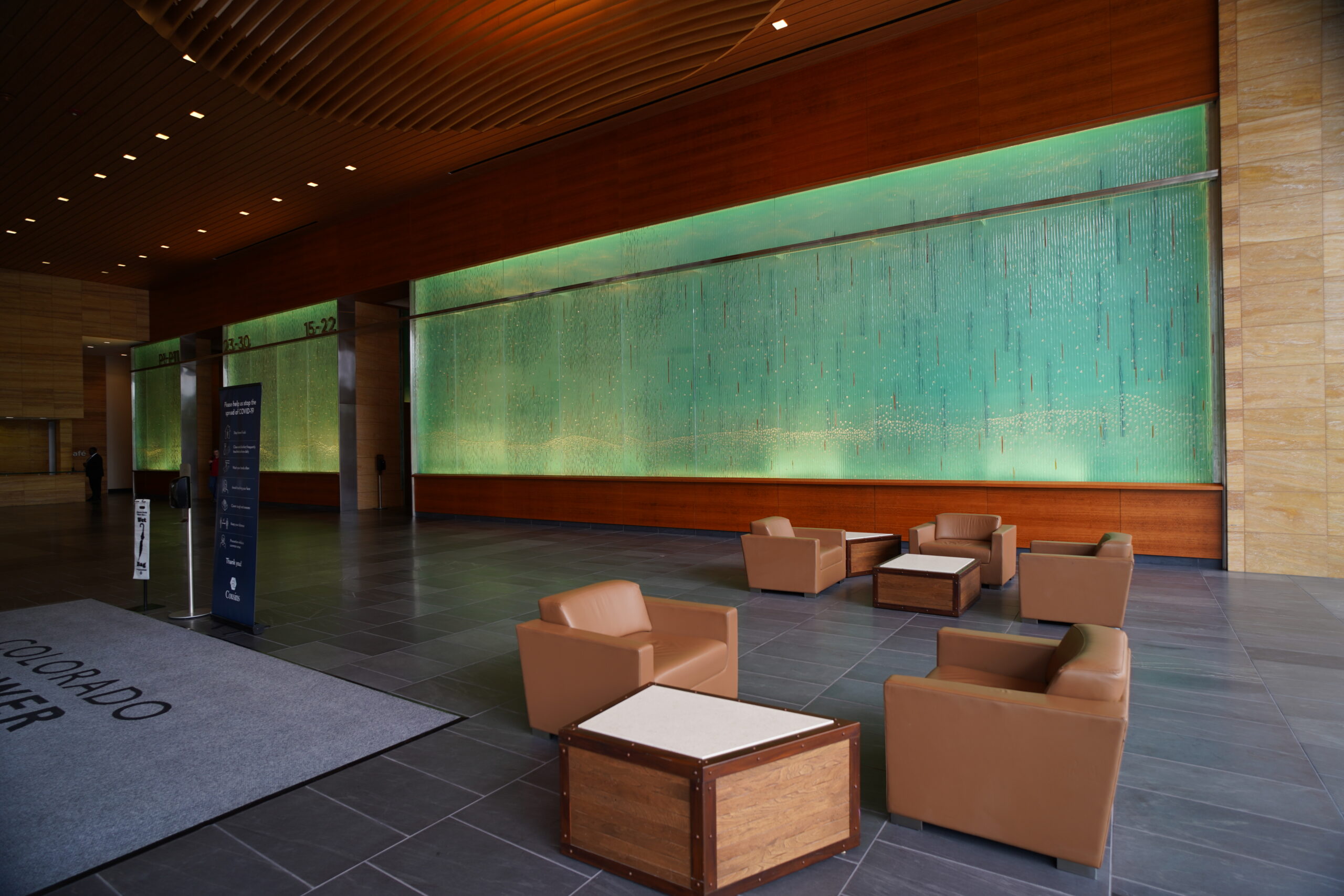 Colorado Tower is located in downtown Austin, just a few blocks from the Colorado River. The client requested that the river serve as a reference and inspiration for the design of the architectural glass wall that spans the full width of the tower’s main lobby. Highly visible from the street, this installation functions as a defining visual identity for the building at street level.