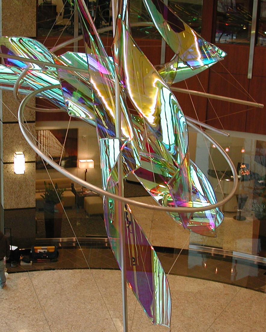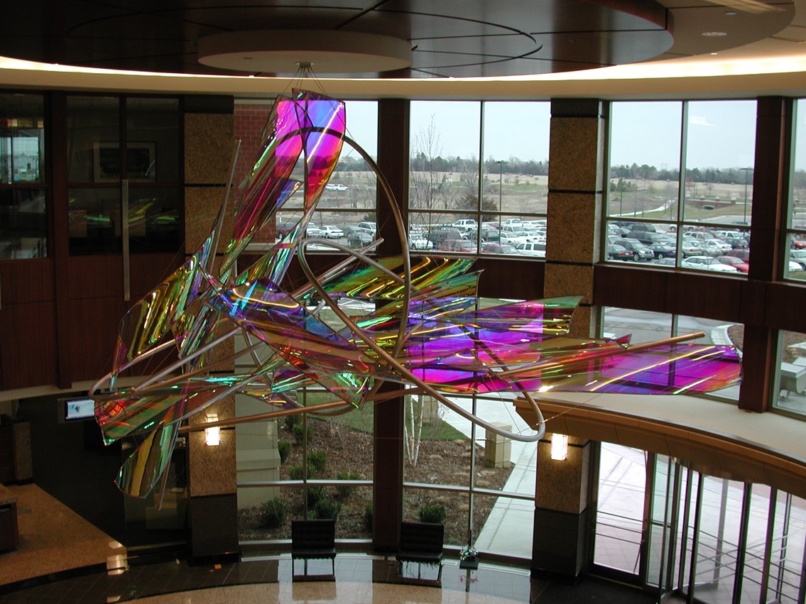 Suspended in the center of the lobby entry is a dichroic acrylic and aluminum sculpture. The dichroic acrylic is curved to create a sinuous form to represent the fluidity of flight in reference to the aero-space companies with offices in the building. The work is located at the ceiling level of the lobby so it could be viewed from the offices on the second level.