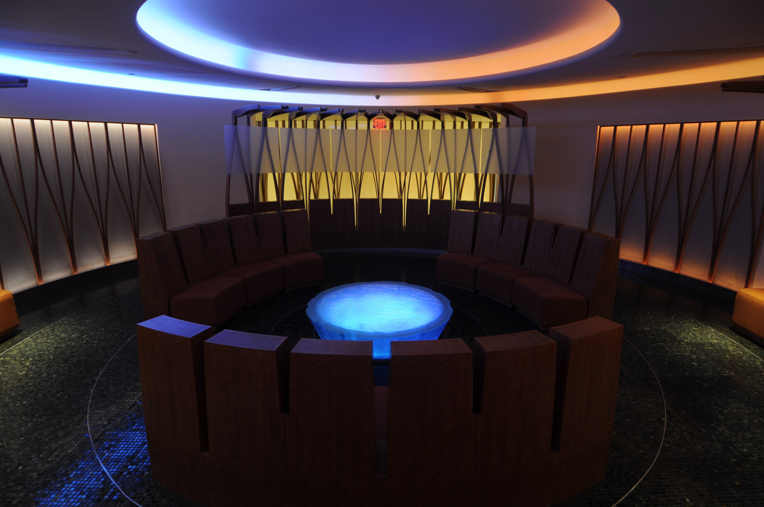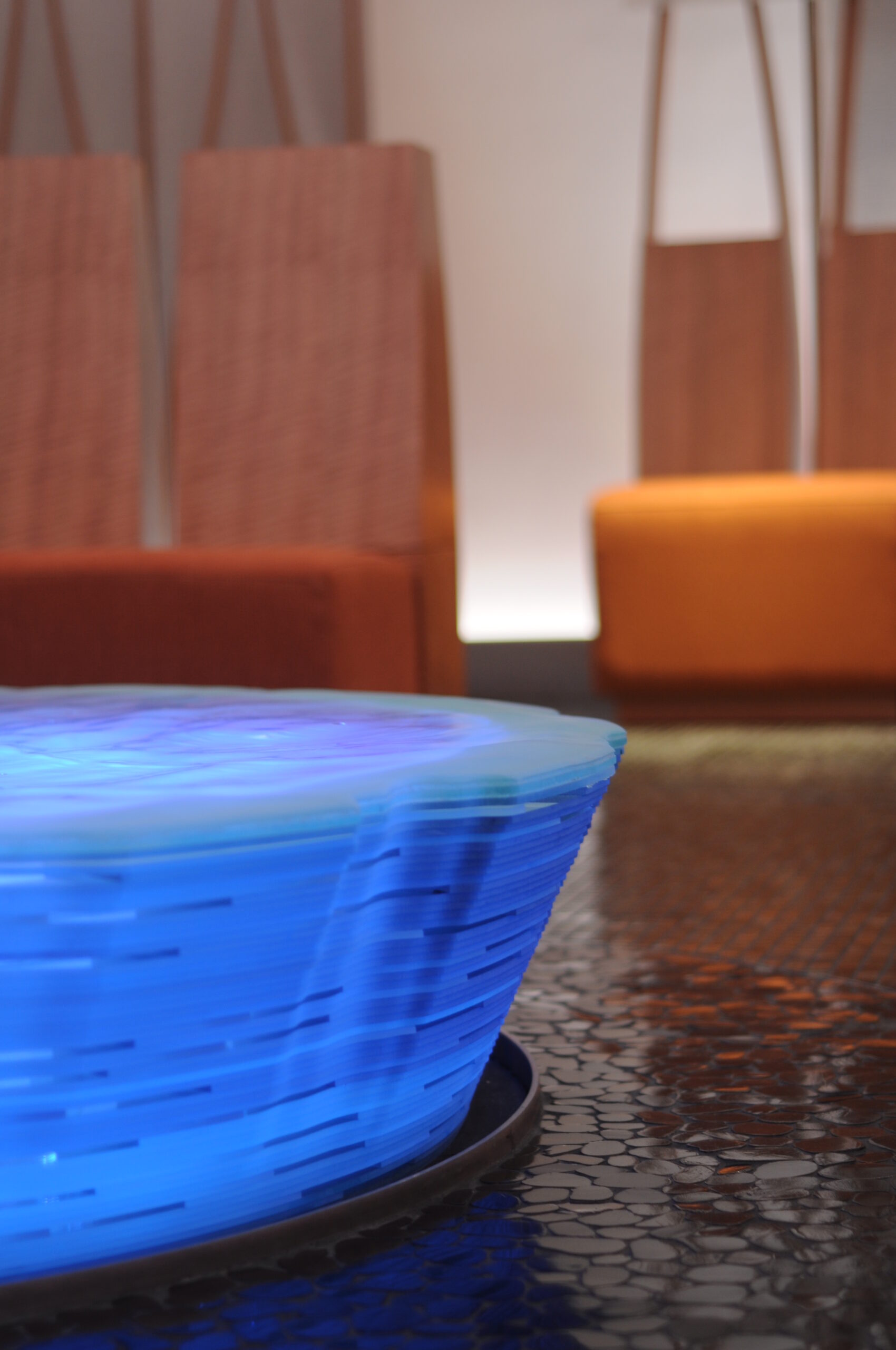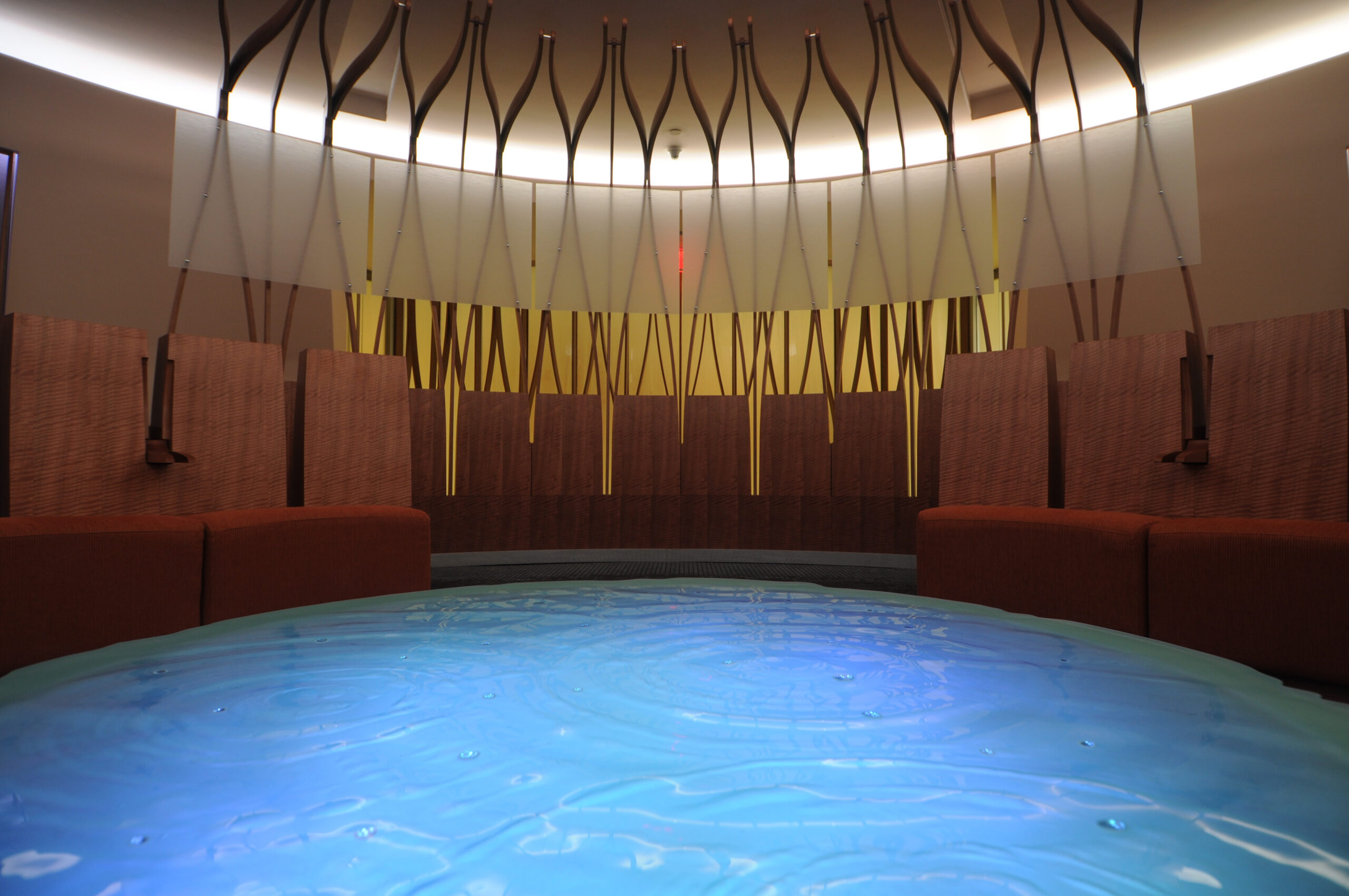 The central feature within the meditation room of the center is a glass and light art work that is intended evoke a calm, contemplative feeling. The original inspiration was a water feature, though this was not practical for a cancer hospital, so the form of a fountain served as the starting point for the design. The final work is a circular element, 4’ diameter and 18” tall, that was composed of stacked pieces of heavy plate glass as the perimeter walls and which were cut by water jet to achieve an undulating surface as though formed by water. The top of the work is cast/tempered/laminated and etched glass with a form suggestive of ripples on the surface of water. Within the element is an LED light source that rotates a color cycle corresponding the colors of the 7 chakras, which are the energy centers of the body. These colors are diffused by the etched surface of the glass perimeter, creating a soft glow of colors which also animates the dappled surface texture.