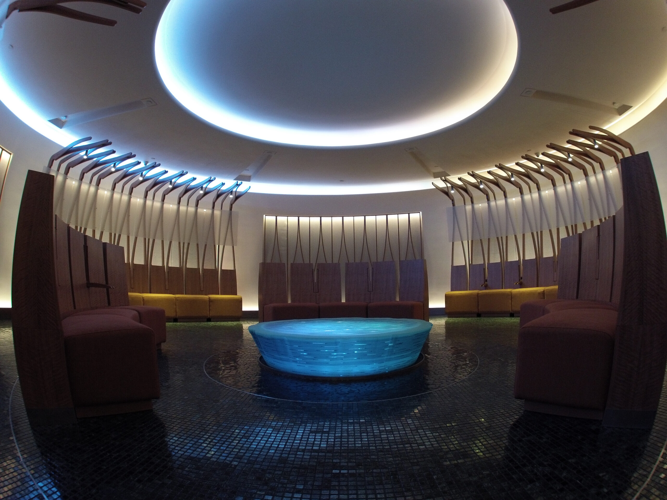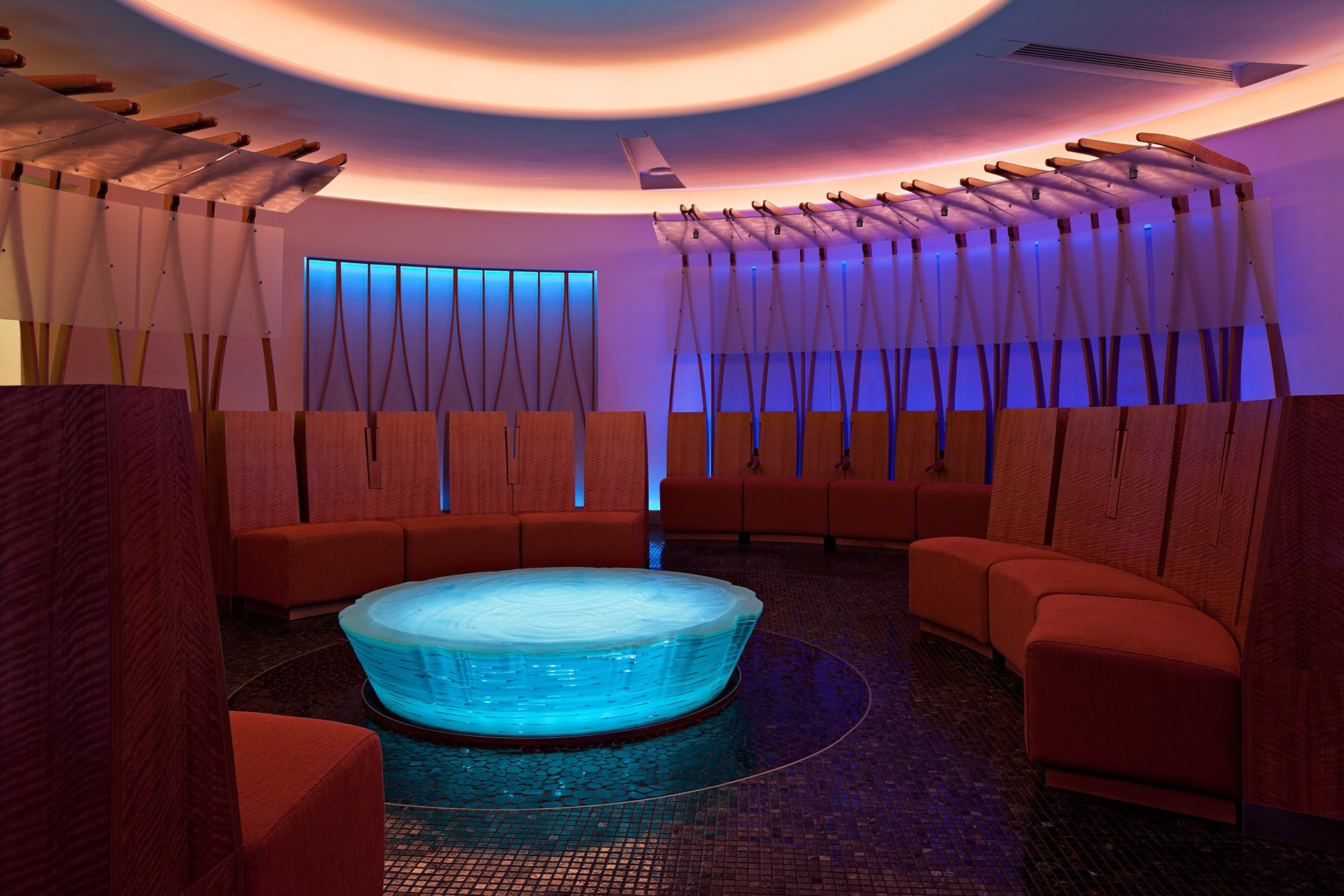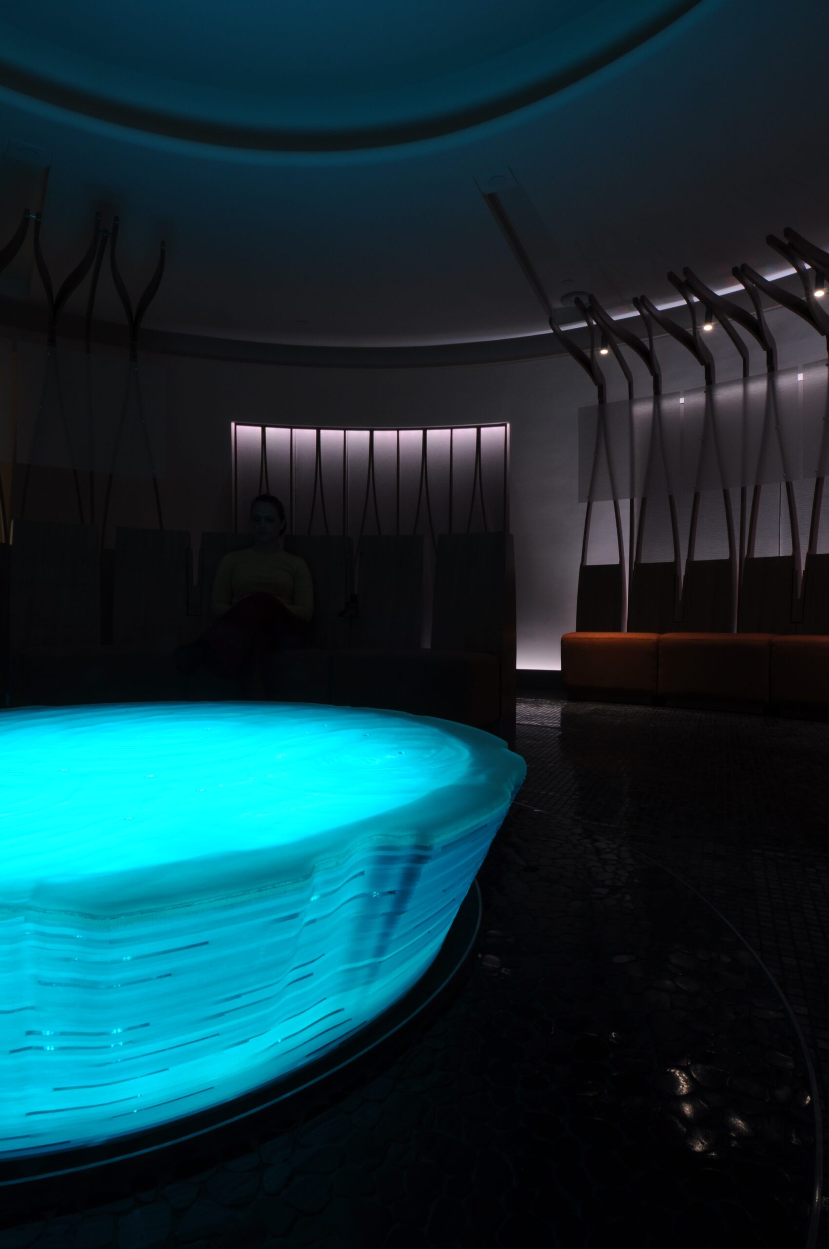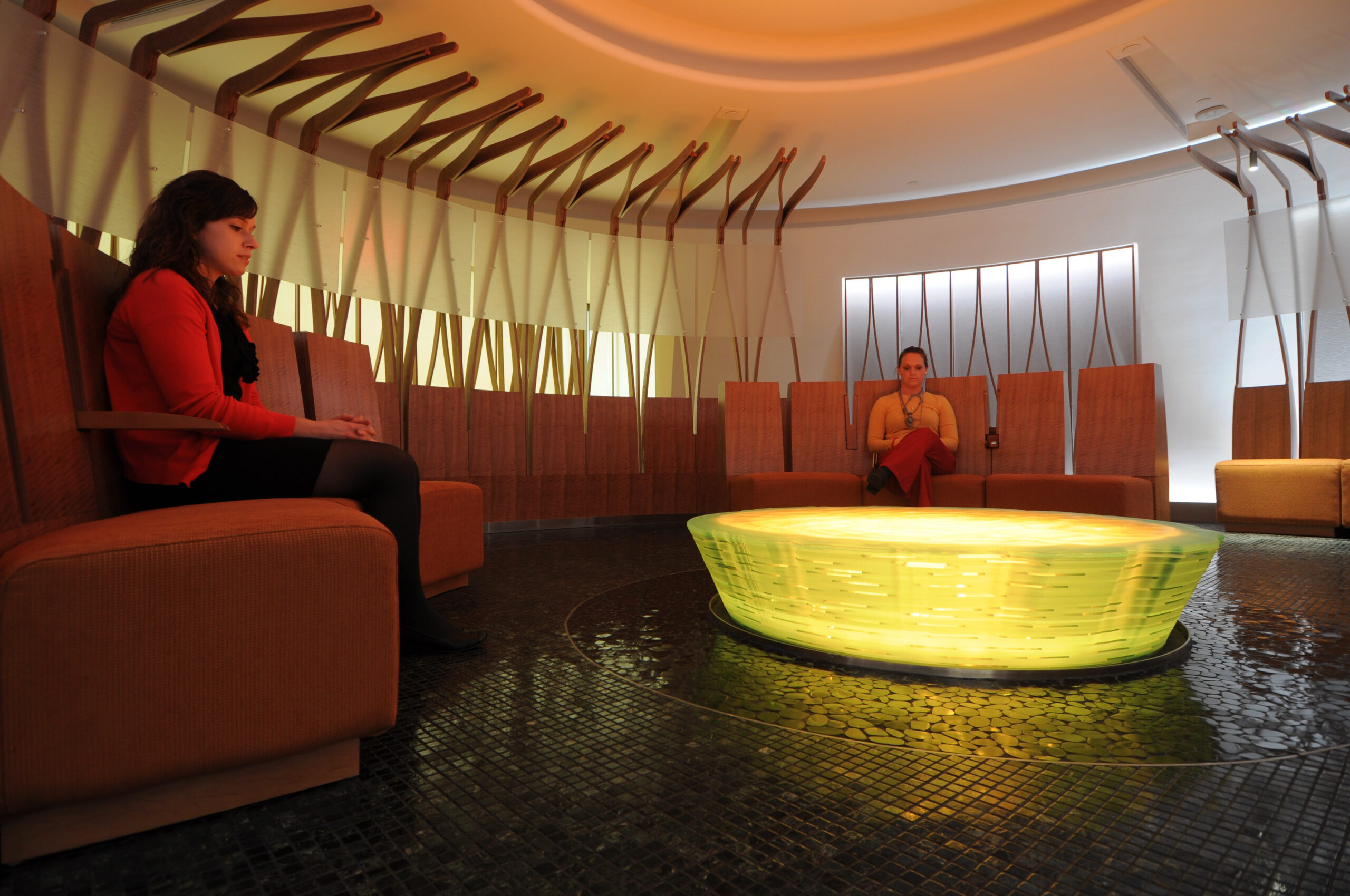 The central feature within the meditation room of the center is a glass and light art work that is intended evoke a calm, contemplative feeling. The original inspiration was a water feature, though this was not practical for a cancer hospital, so the form of a fountain served as the starting point for the design. The final work is a circular element, 4’ diameter and 18” tall, that was composed of stacked pieces of heavy plate glass as the perimeter walls and which were cut by water jet to achieve an undulating surface as though formed by water. The top of the work is cast/tempered/laminated and etched glass with a form suggestive of ripples on the surface of water. Within the element is an LED light source that rotates a color cycle corresponding the colors of the 7 chakras, which are the energy centers of the body. These colors are diffused by the etched surface of the glass perimeter, creating a soft glow of colors which also animates the dappled surface texture.
