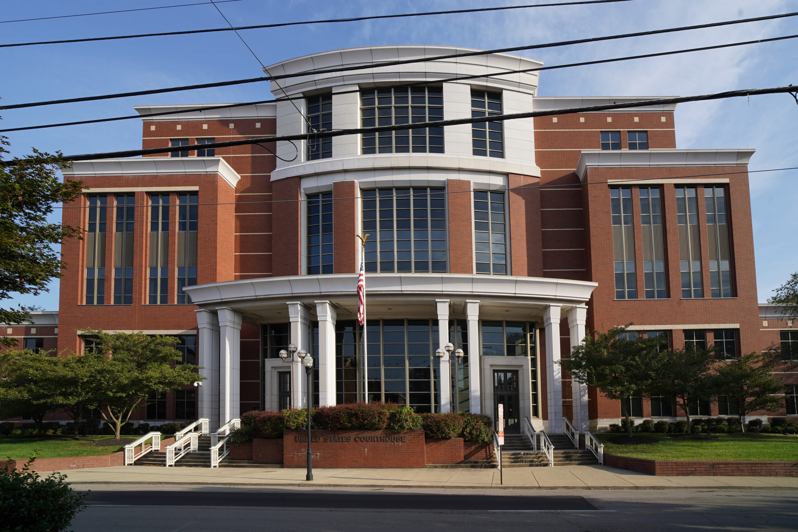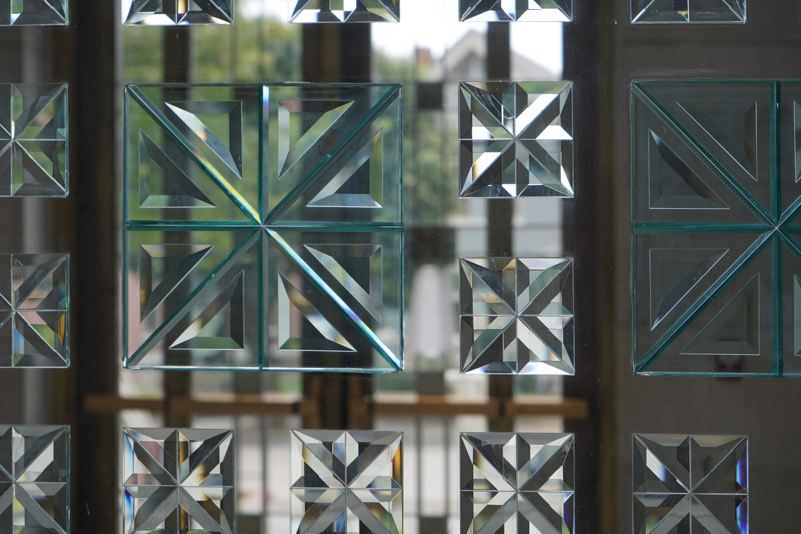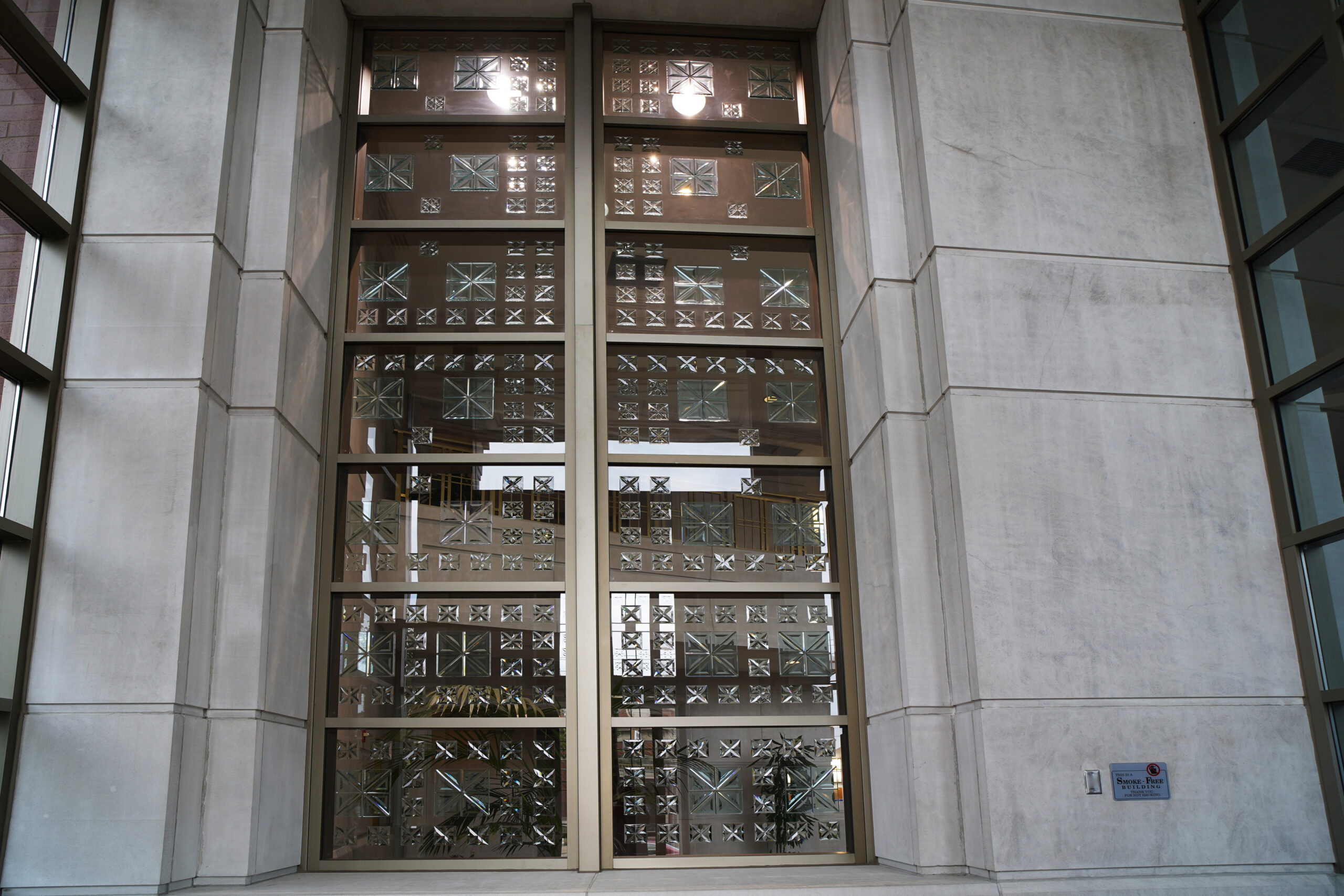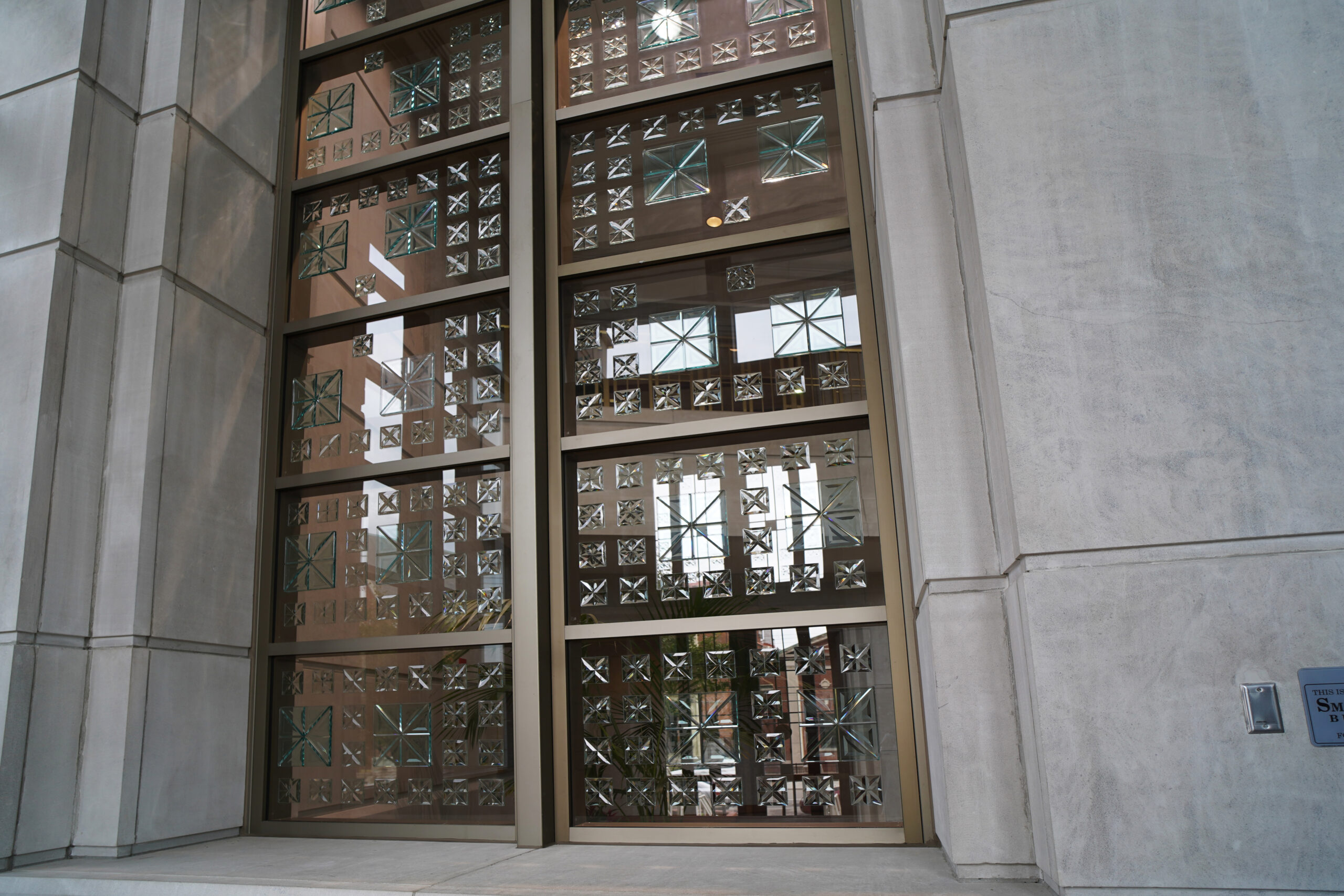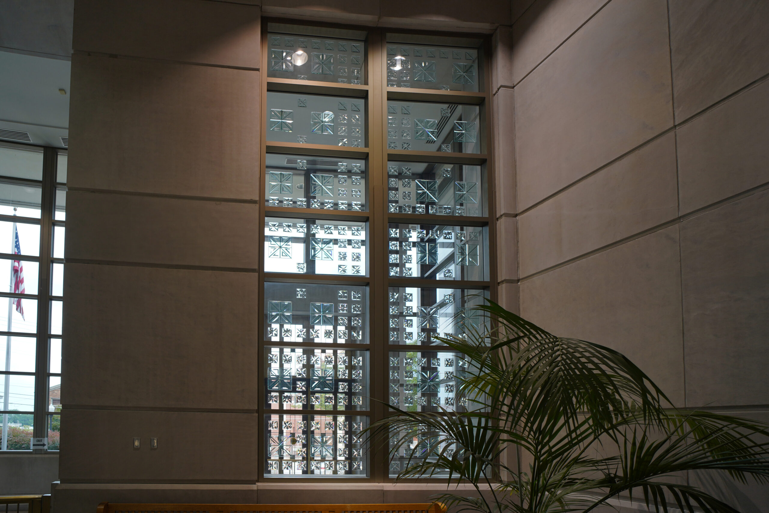 The entry lobby of the courthouse features large windows that are composed of tempered glass with laminated prismatic glass on both surfaces in a pattern associated with Federalist architecture in reference to the style of the architecture. The prismatic glass fractures the movement of cars as they pass by creating a dynamic visual appearance.