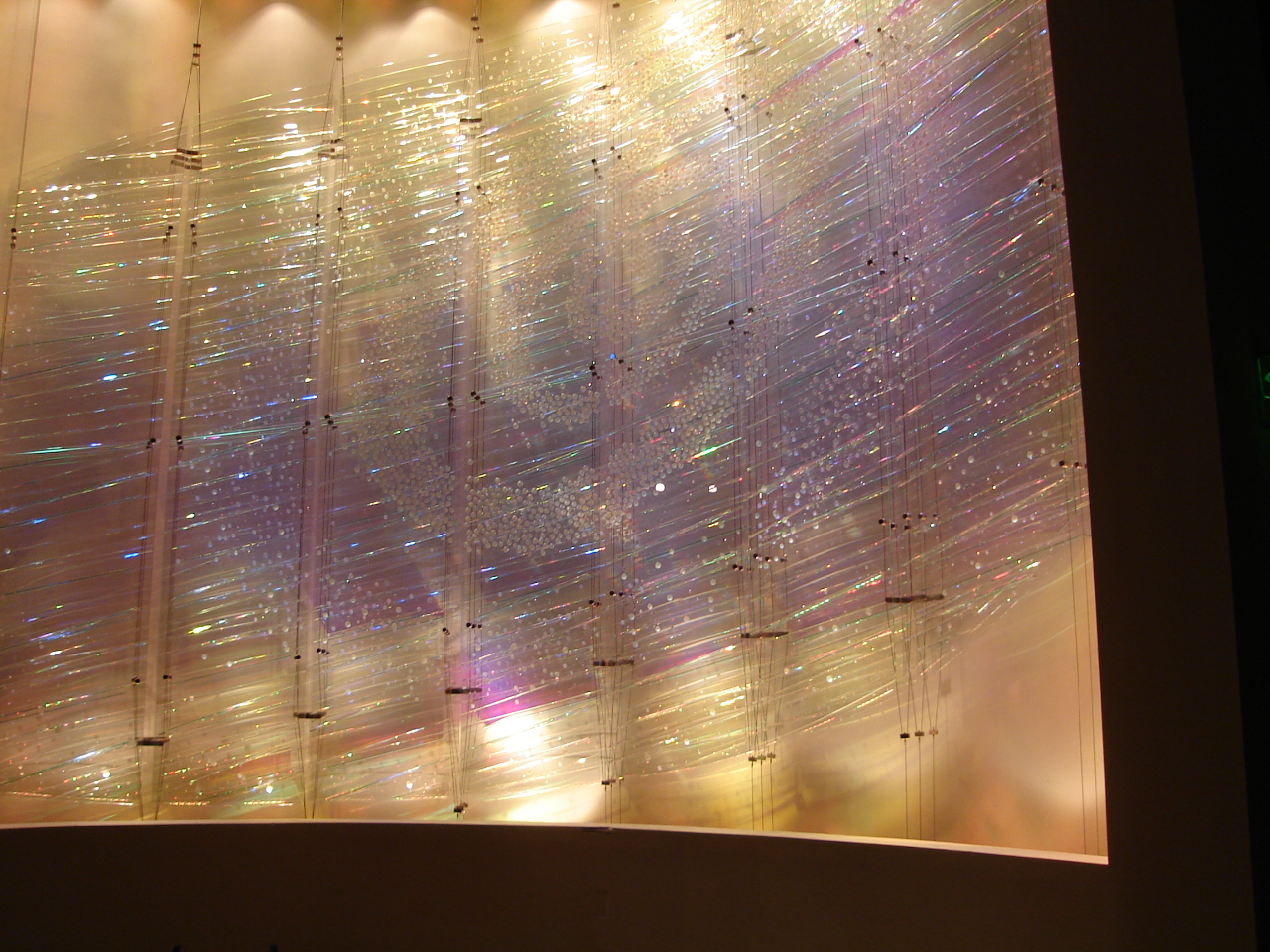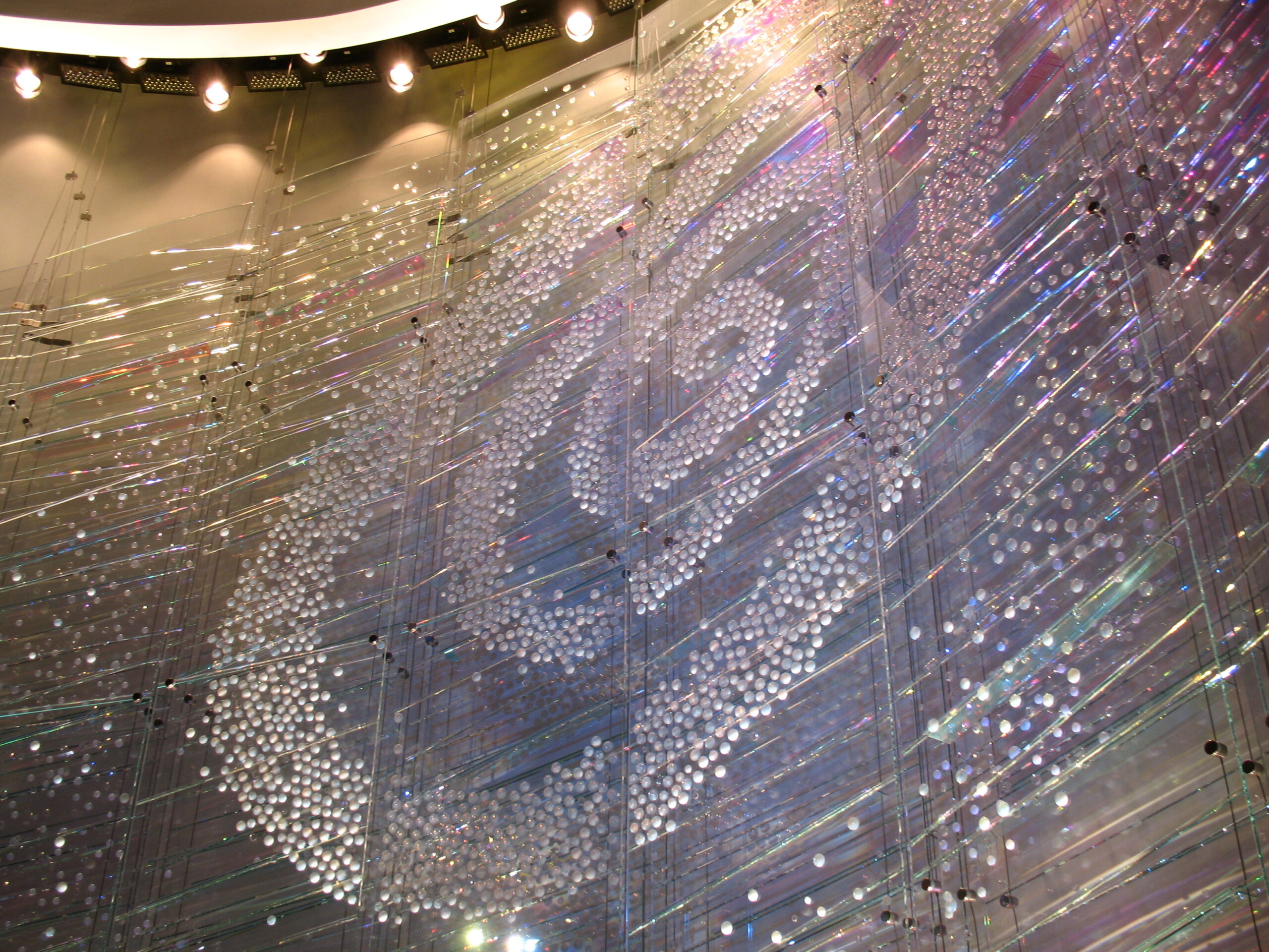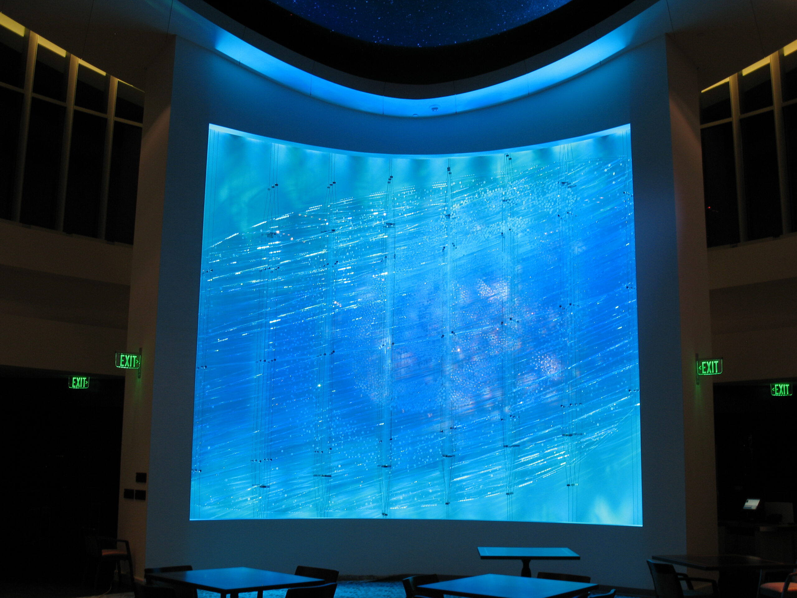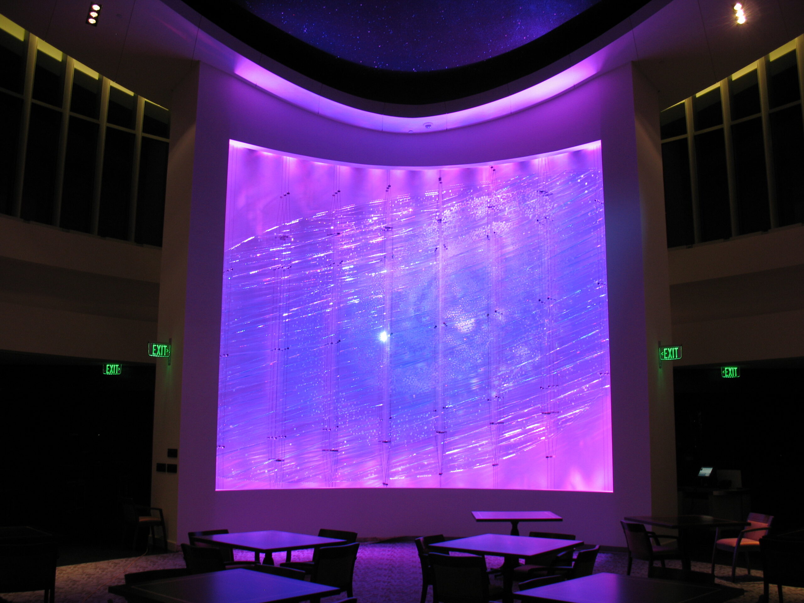 This custom-designed feature consists of a curved freestanding backdrop with glass prisms suspended by stainless steel cables. The prisms are illuminated by precision LED projection, programmed to transition through a daily cycle of colors. The interplay of light and glass creates a captivating, ever-changing visual effect that enhances the space’s modern architectural design.
