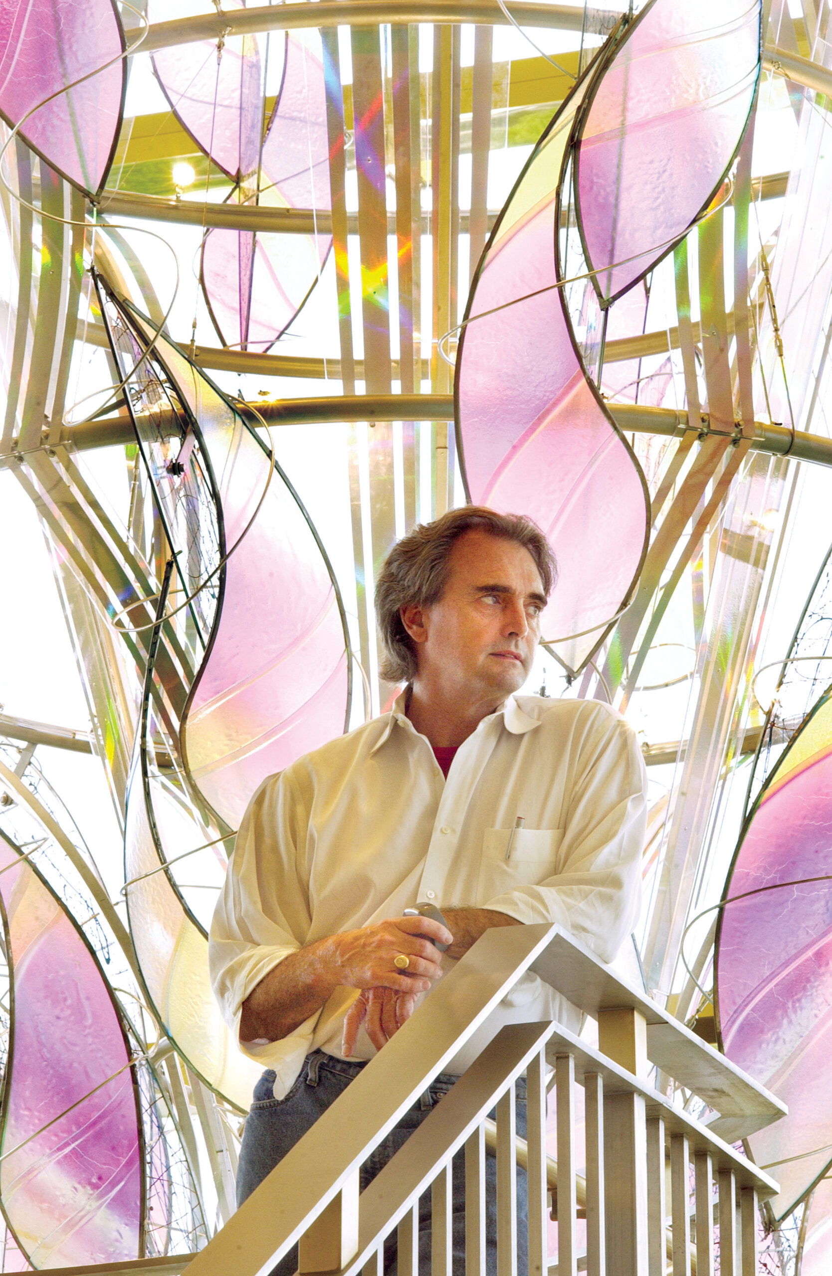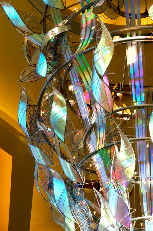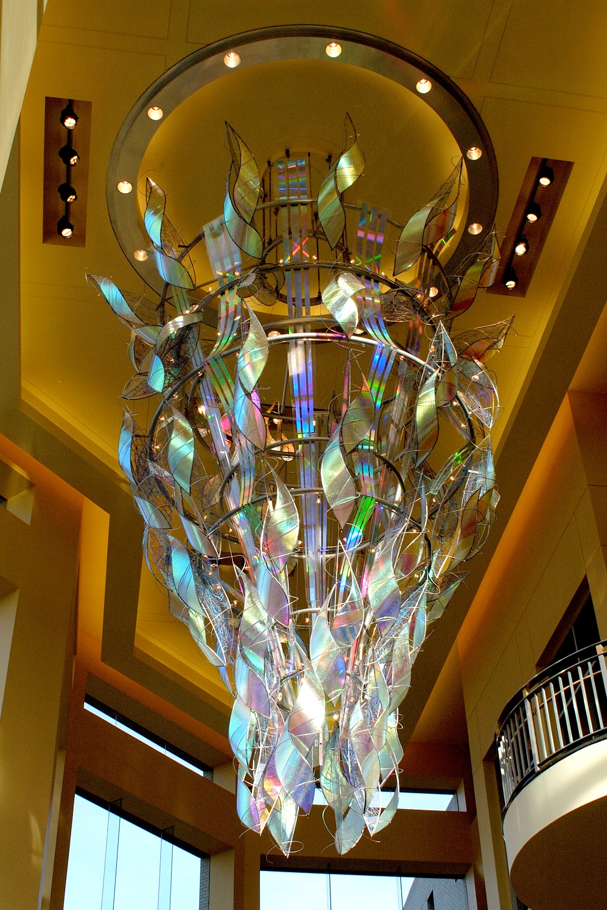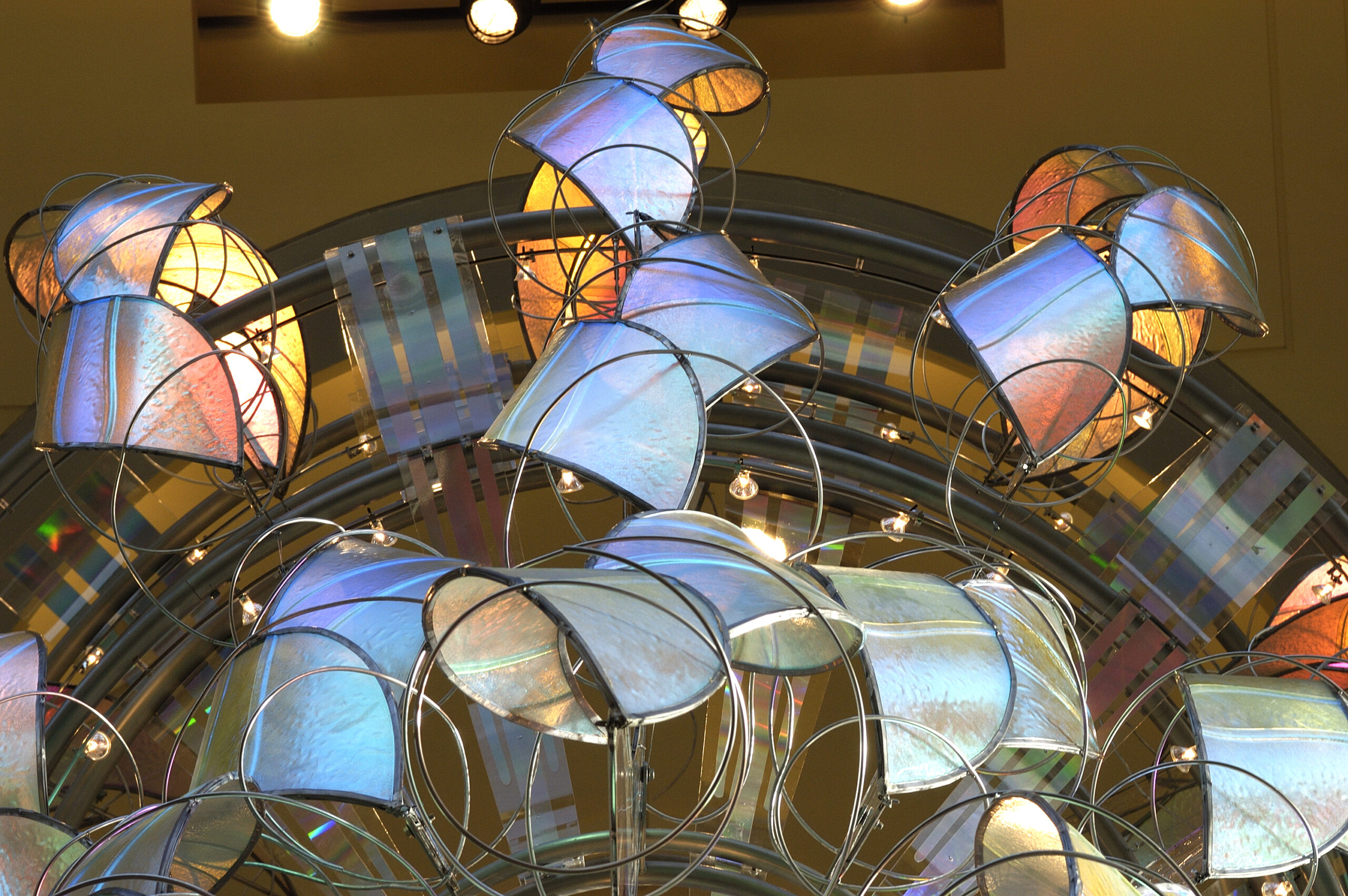 The sculpture was created as a visual expression of growth, change and transformation. The spiraling elements of curved dichroic glass establish a vertical movement that creates a form suggestive of a flower blossoming. The dichroic glass was used because of its characteristic of changing color as it is seen from varying positions, which creates a dynamic quality. With the floral form, spiraling movement, and transforming colors, the concept of growth is created as a symbolic representation of the mission and role of the health care facility not just in treating aliments, but is sustaining the vitality of life.