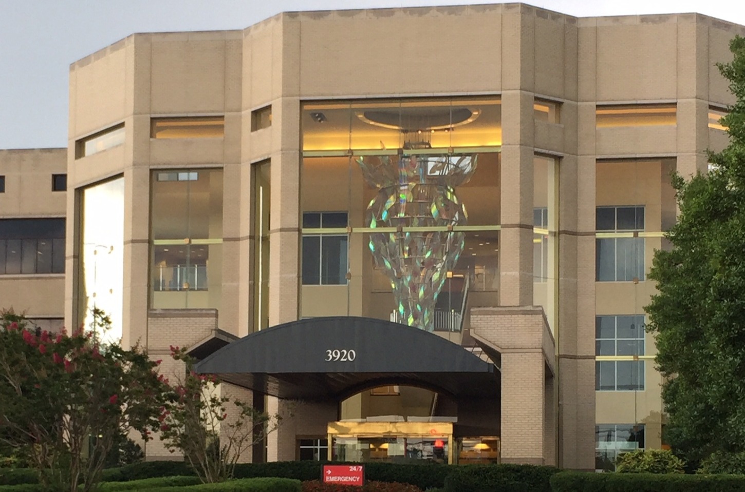 The sculpture serves as an identity for the hospital as it is located as the most visually prominent element of the entry elevation. Because of the unique characteristics of the dichroic glass the work is seen with both reflected light from the exterior as well as the interior lights focused from the interior.