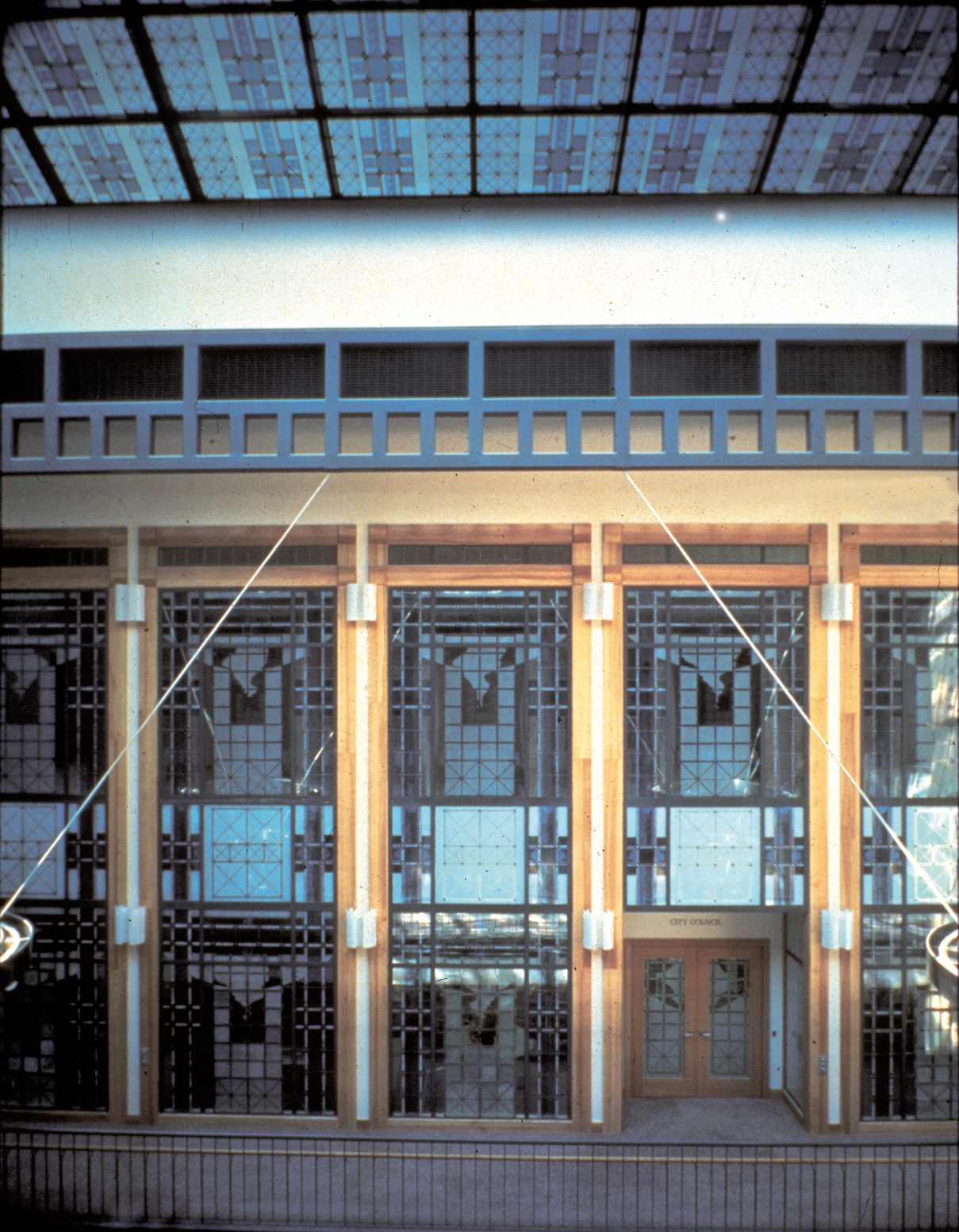 The office windows were assembled as leaded glass panels which were incorporated within insulated glass units to meet fire code requirements and to reduce sound transmission. The insulated glass units of the skylight has laminated glass panels as the interior glass, which incorporates a film with a pattern printed with both transparent and opaque pigments, which cast patterns and colors into the atrium space.