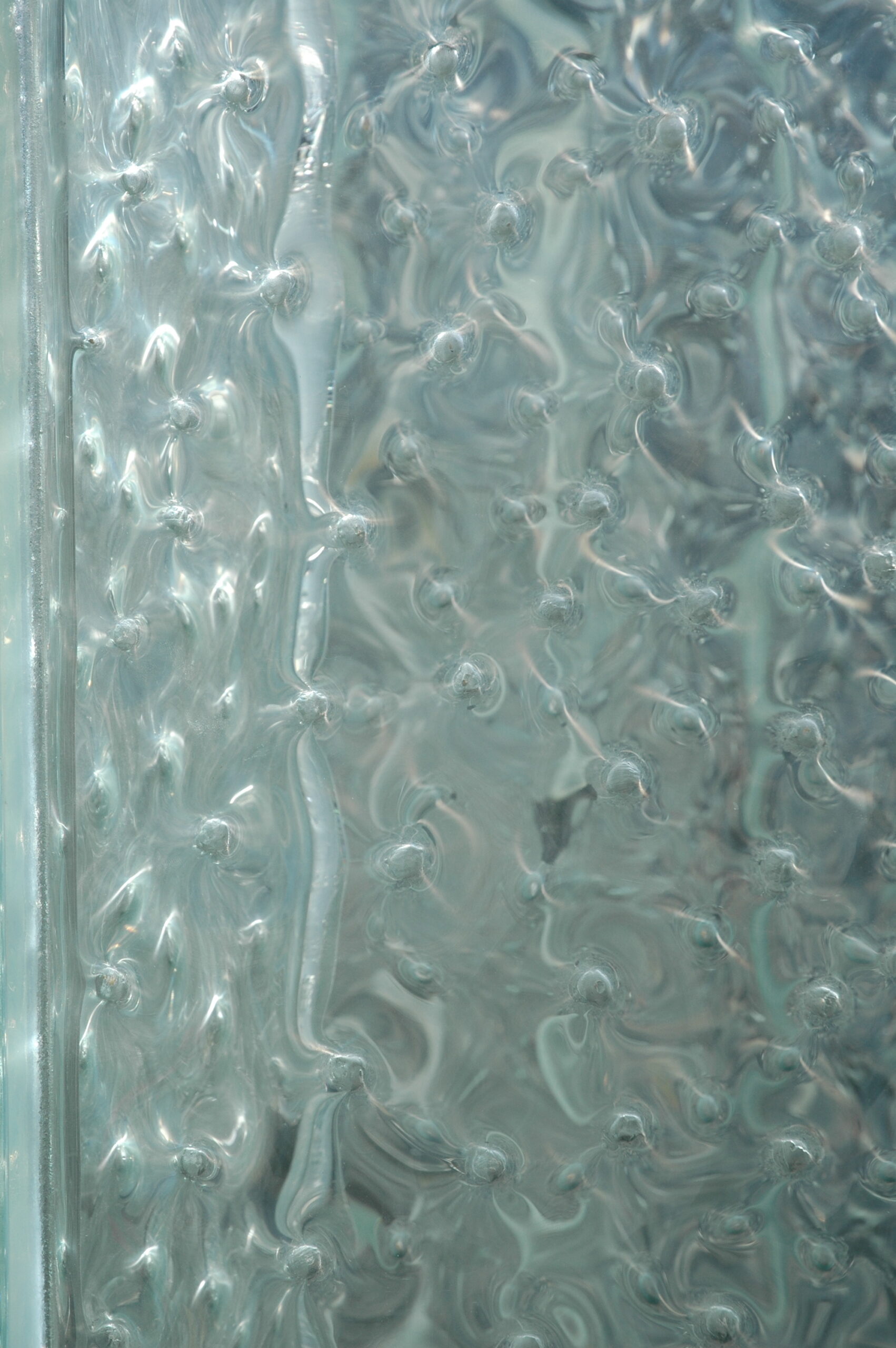 As water flows down the surface of the columns it flows into the depressed divot of the glass texture by its capillary action but pops off the surface from the force of the flowing water, creating a unique effect of water spraying off the surface of the glass surface like a fine mist. The water that fills the fountain and the columns originates at a glass ‘waterfall’ at the top of the plaza, and flows down a runnel into the fountain.