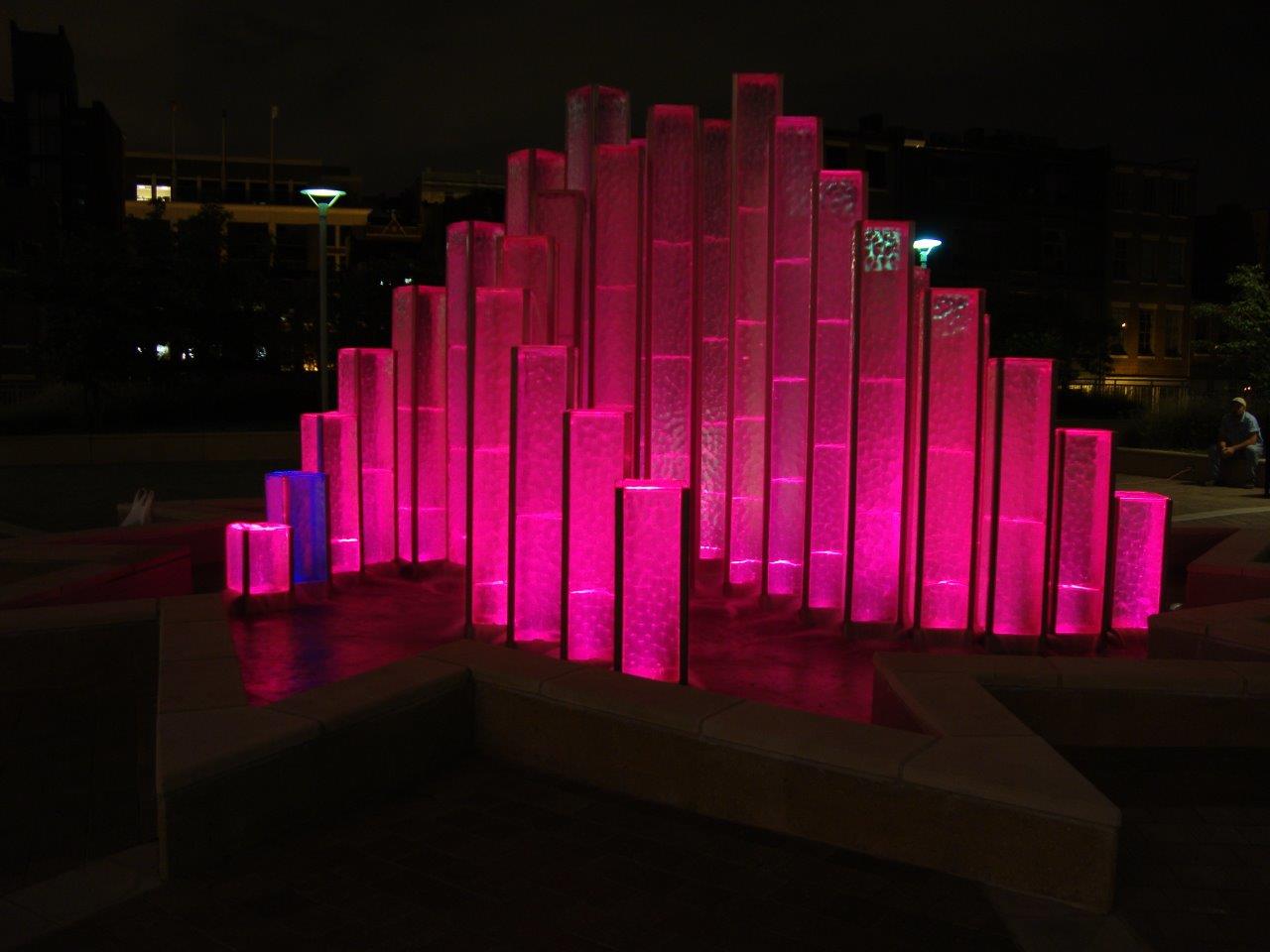 The feature element of the plaza designed by Athena Tacha is a central water feature that is composed of 48 cast glass columns from 4’ to 12’ tall which are filled with flowing water that flows over the top of the column and cascade down the surface of the cast glass columns. The pump for the water at the bottom of the columns has an aerator which introduces large air bubbles that float up the column of water. These columns of flowing water and air bubbles are illuminated from beneath with LED lights that are programmed to rotate colors at night.
