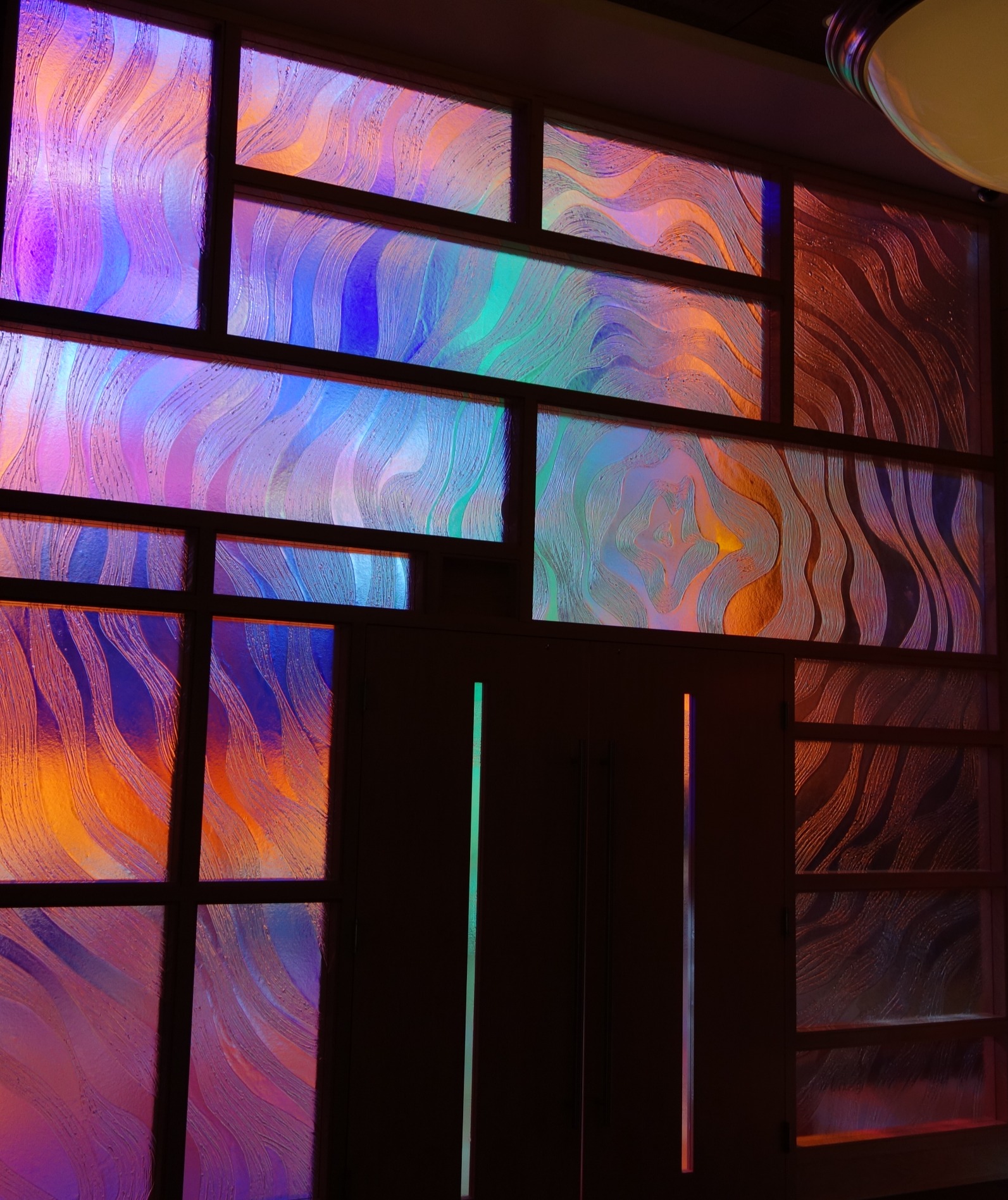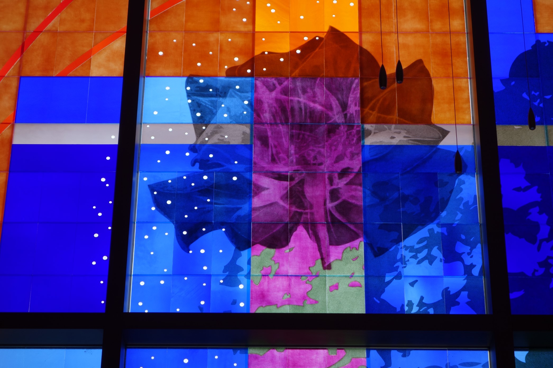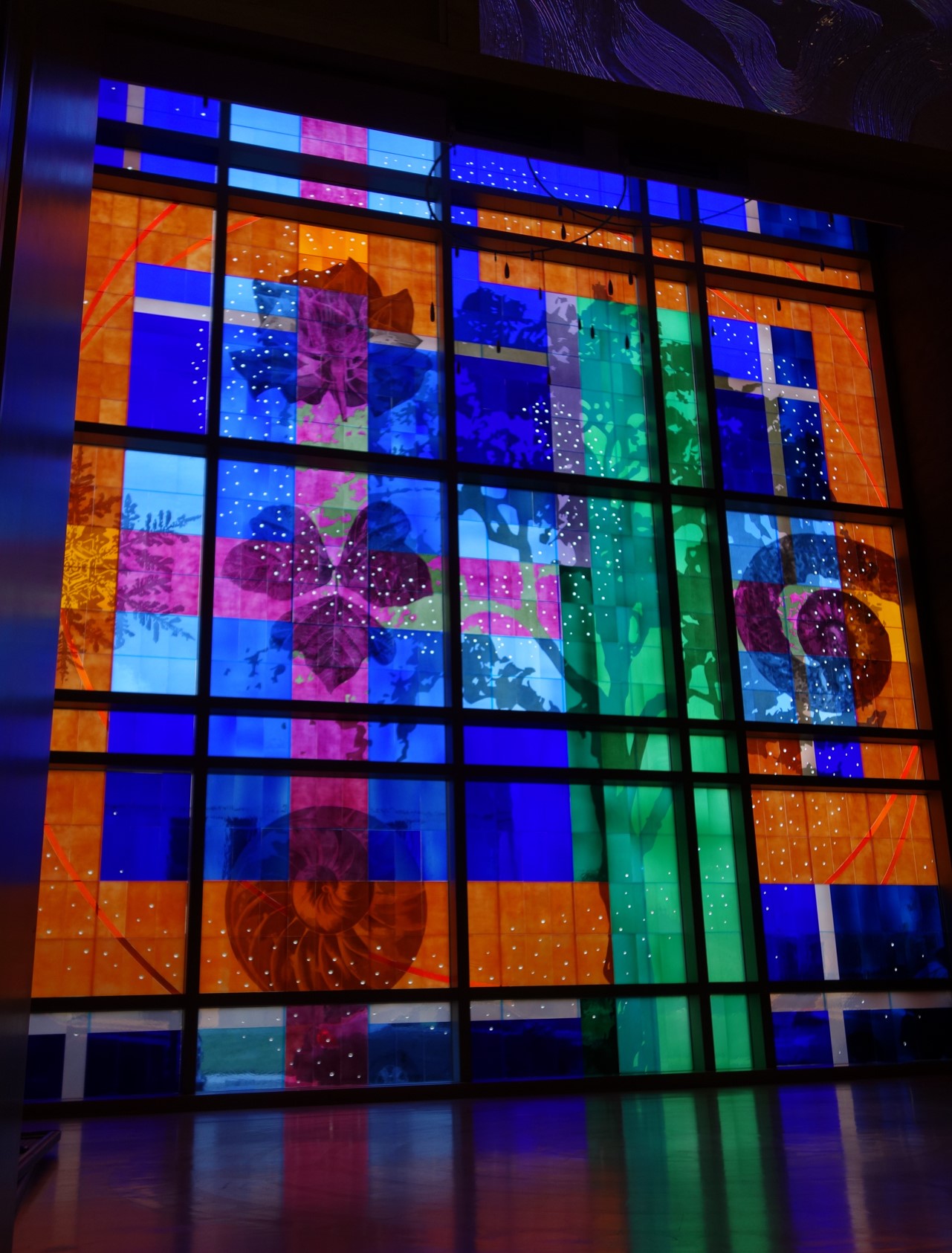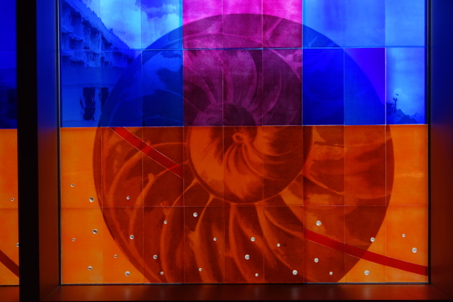 The composition of the work is an array of images relating to life ; a tree, flowers, nautilus shell, leaves, etc. as an expression of the central theme of the window, life. The title of the work, “Nurturing Life”, is intended to be understood in two ways ; one as the nurturing of life, and the other as life providing the nurturing, both of which relate to the process of treating cancer. While the primary background of the work are deep blue colors, the strongest visual element is the orange framing element which introduces a bold form within the field of blue, which represents the strength necessary to fight cancer. Supporting this concept is the central natural element which is a tree, also representing this quality of strength. The deep blue background was used to provide a quiet, contemplative space. Within this blue field are prismatic glass jewels inlaid into the glass and arranged in the form of a fibonacci spiral to represent the natural order of growth. These jewels also represent ‘seeds of hope’ that through their transformation of light into prismatic colors that are cast throughout the space.