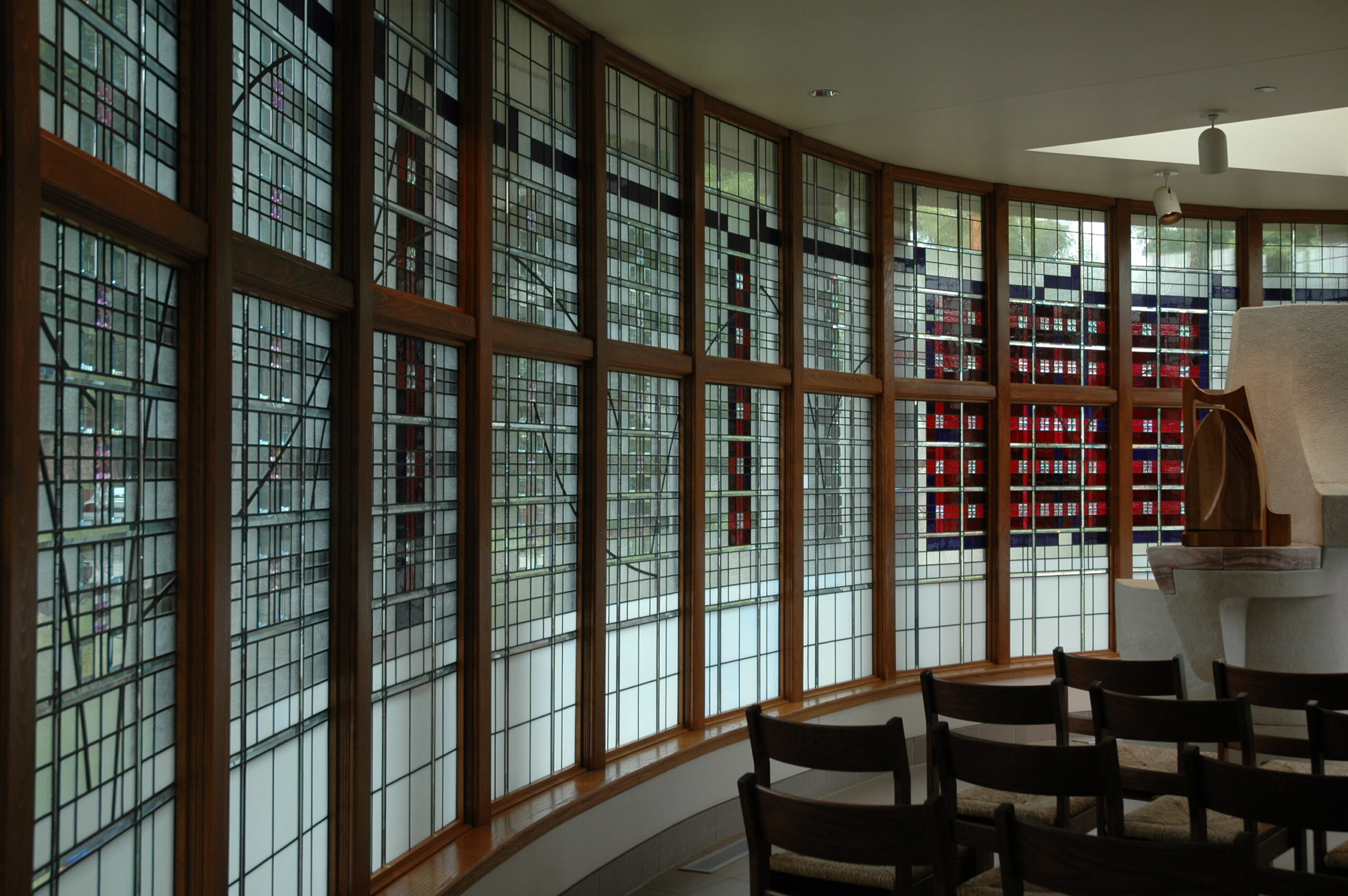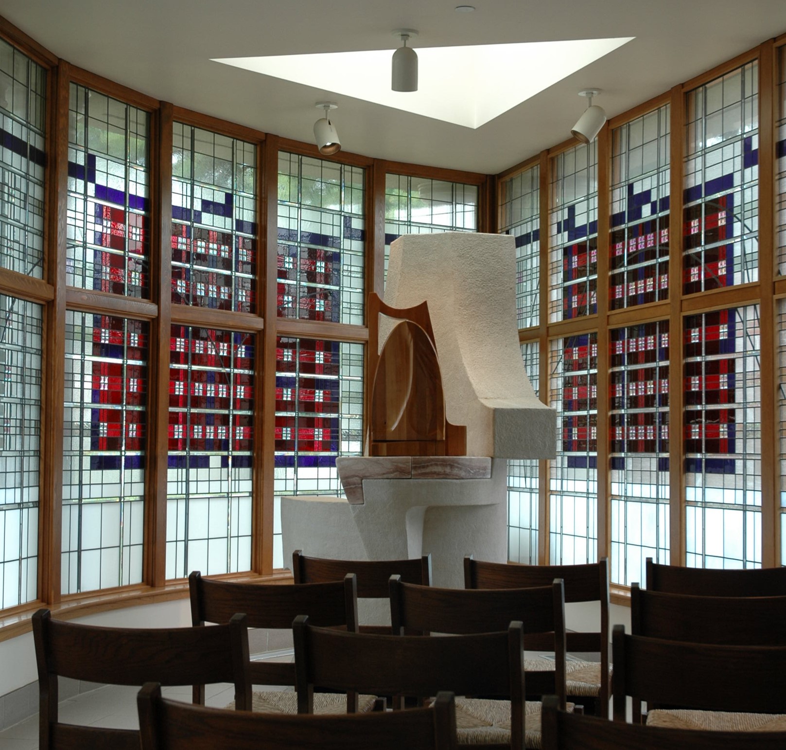 Serving as an element to help guide visitors into the chapel from the hospital lobby, is the architectural glass art wall that terminates at the location of the Tabernacle within the chapel. The work evolves from clear antique glass that obscures the exterior landscaping into to a field of royal colors of red, purple, and blue that surround the tabernacle, serving as a backdrop, and thereby visually establishing its primacy within the chapel.