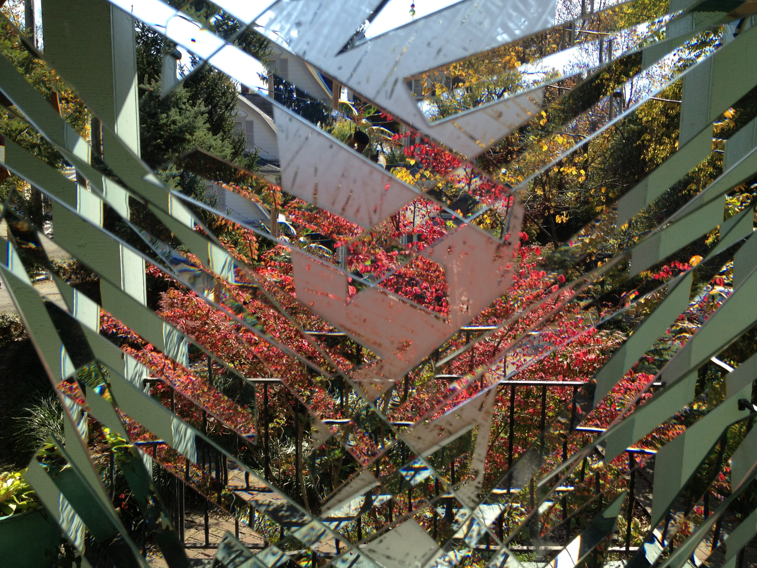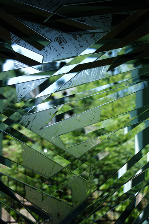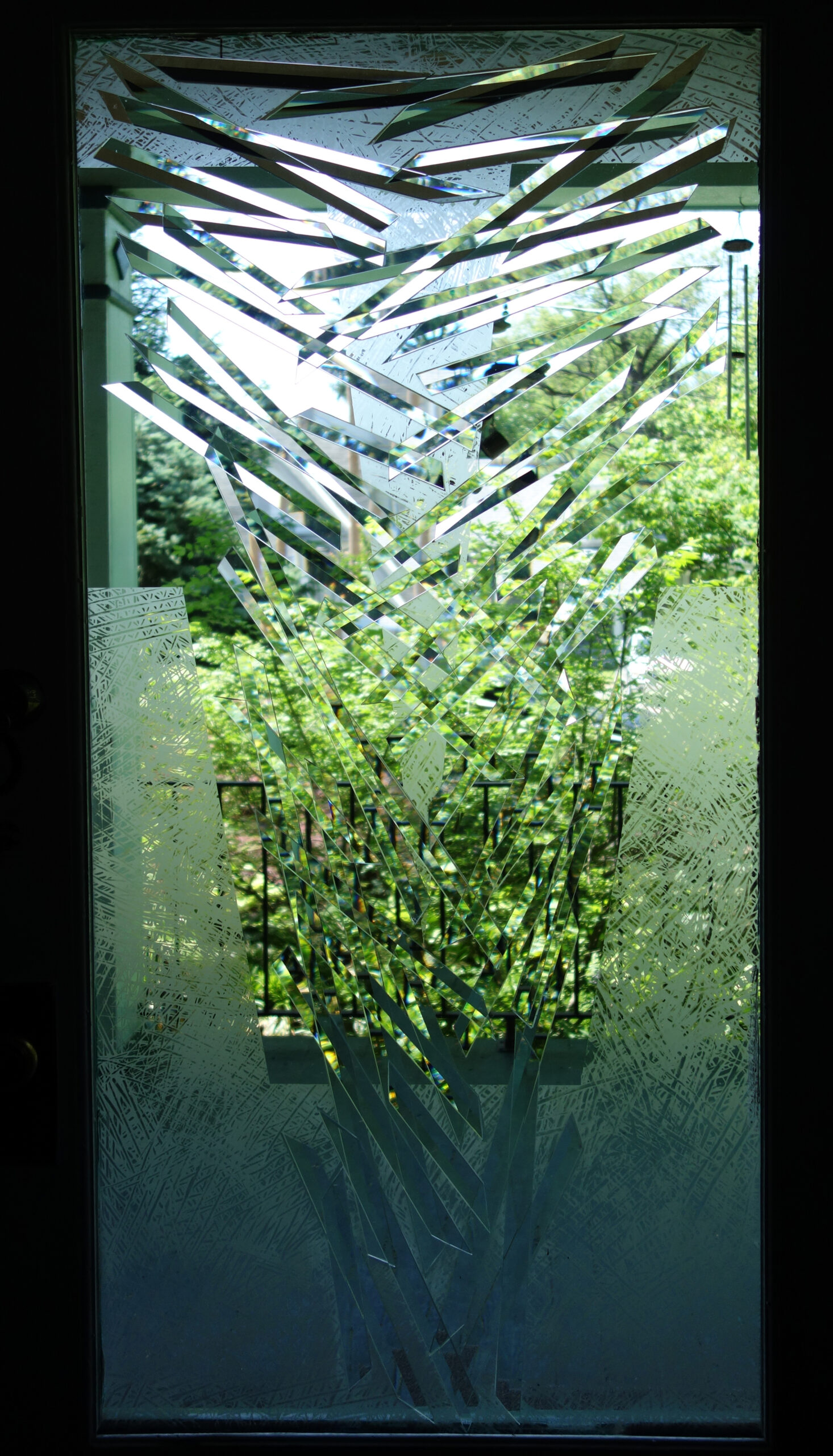 The composition of this entry was developed as a symbolic representation of the 911 attack, for the original door was damaged on the day of 911, necessitating the new door. The work is composed of laminated prismatic glass and acid etching on tempered clear plate glass. The prismatic glass breaks up the view of the natural forms on the exterior, creating a visual collage of forms and colors, which seem to visually shift as the viewer moves by the work, creating a dynamic visual experience. The exterior vegetation changes color with the seasons which the prismatic glass visually fractures creating a dynamic appearance.