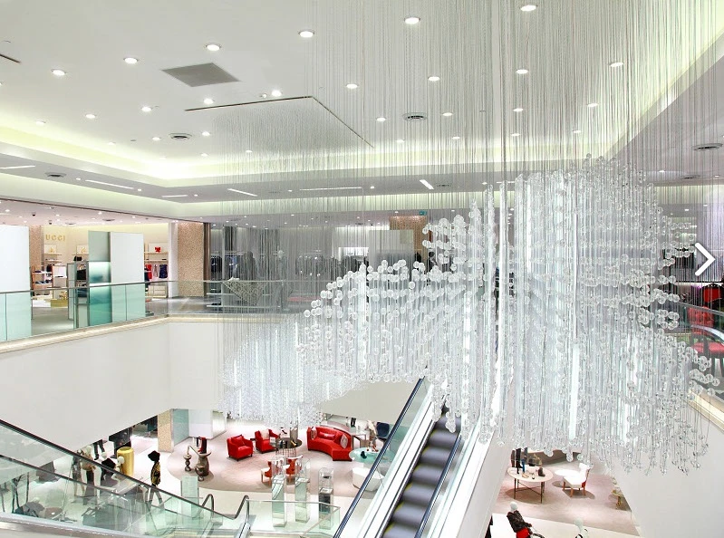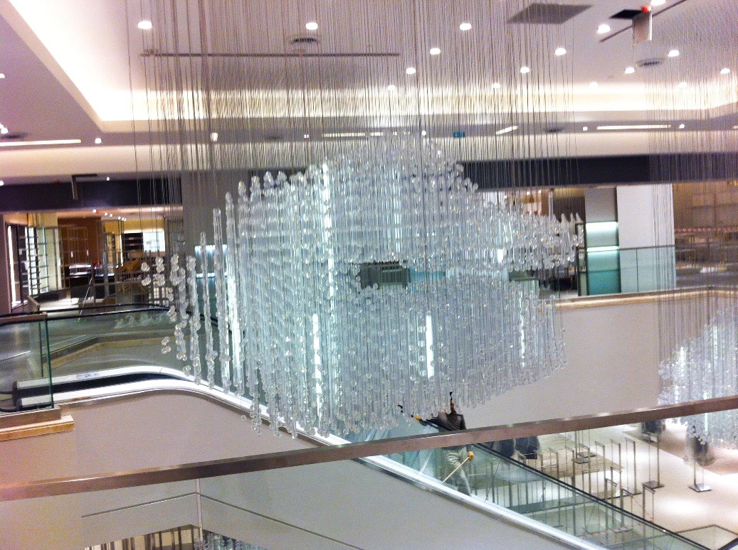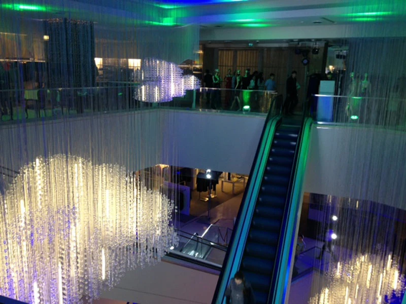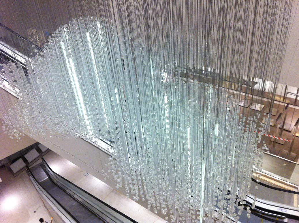 Suspended between the central escalators are ‘clouds’ of prismatic crystals with internal LED lights, which represent the clouds that perpetually surround the mountains around the perimeter of the city with cable cars carrying passengers through the shroud of clouds to the mountain tops. In addition to the illumination internally from LED lights are ceiling lights which focus light onto the clouds.