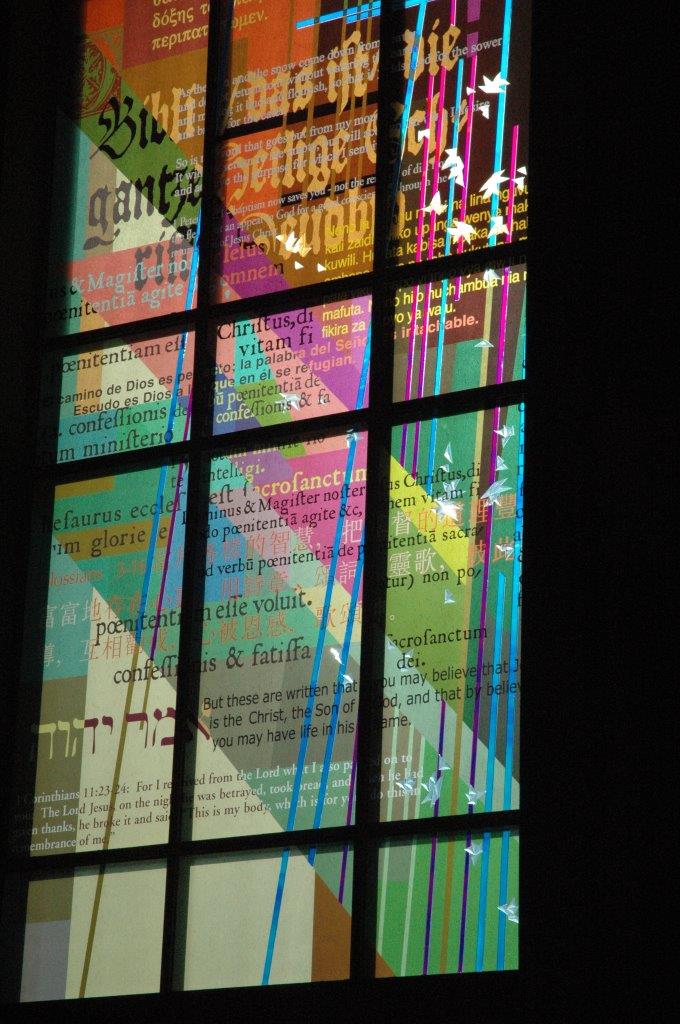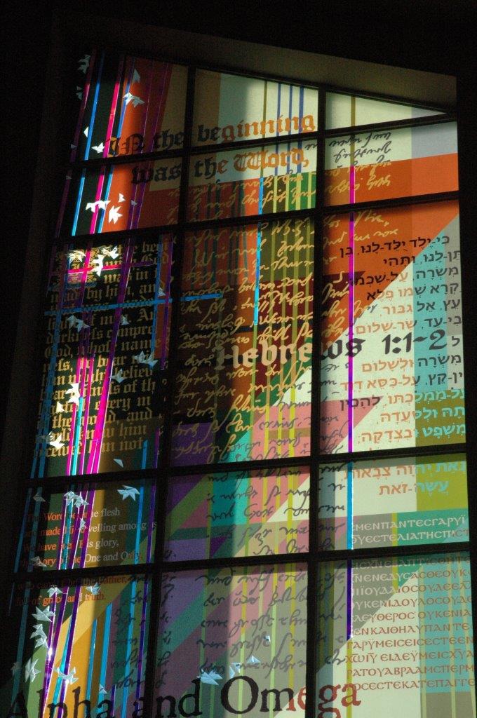 In addition to the printed text, prismatic and dichroic glass elements were introduced to animate the light from the morning sun, casting spectral colors and patterns into the sanctuary. The prismatic elements float randomly through the composition, much like drifting snow flakes, and symbolically represent the omnipresent Spirit. The dichroic glass elements are linear and directional, serving the purpose of directing attention toward the altar. The background composition of collaged triangular forms are also oriented toward the altar.